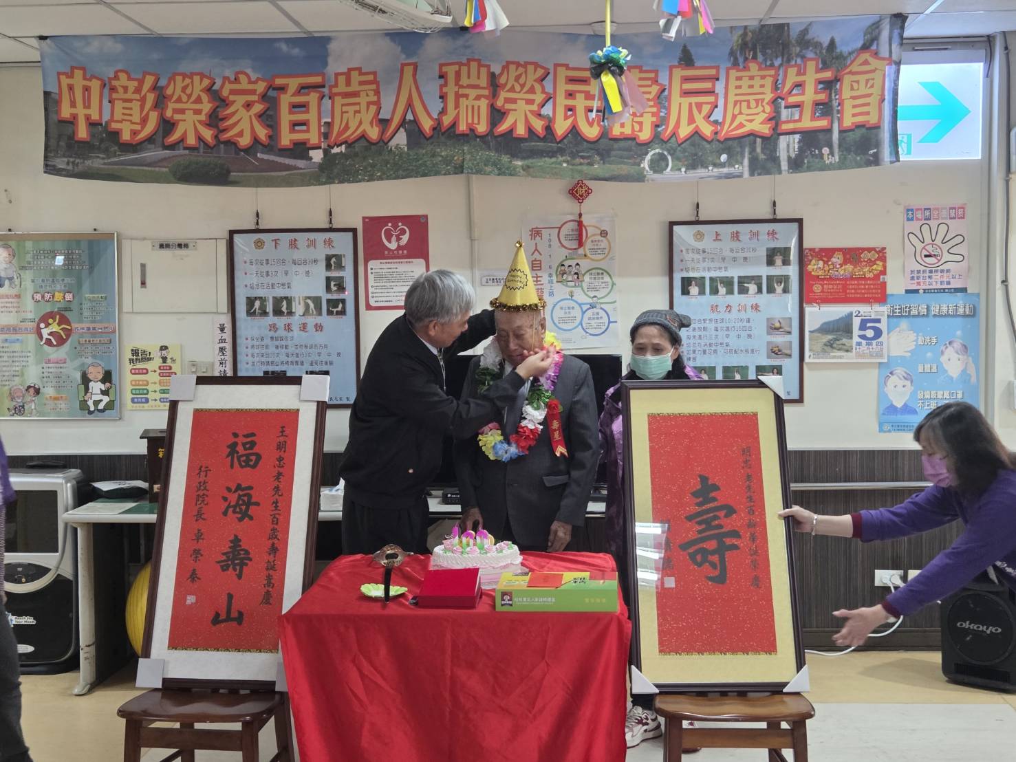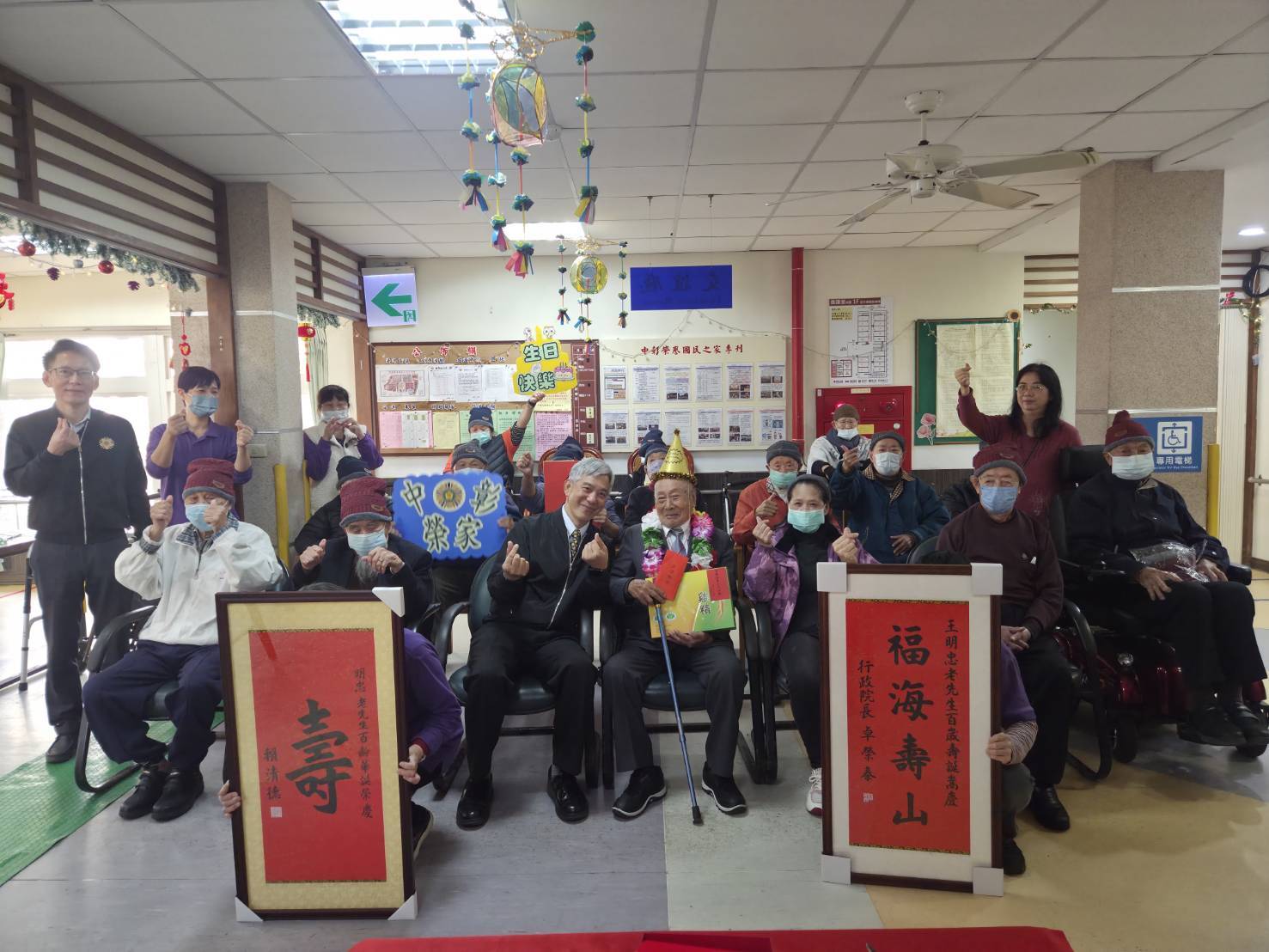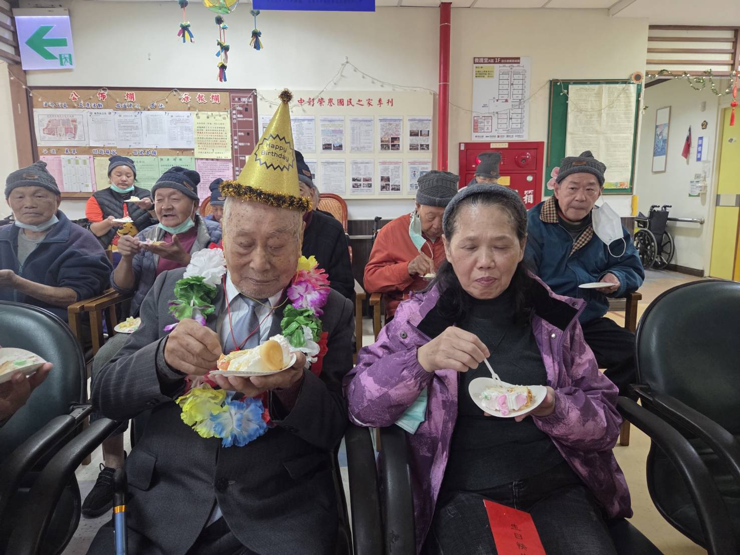 中彰榮家舉辦百歲慶生會 住民及家屬同賀福壽綿延 中彰榮家今(5)日辦理榮民王明忠伯伯百歲壽辰慶生會,同時也邀來了王伯伯的家屬一同為王伯伯祝壽,一起祝福王明忠伯伯天賜遐齡、福壽雙全。席間榮家主任呂德義除代表賴總統及行政院卓院長致贈百歲壽屏,也代表輔導會嚴德發主委致贈金壽桃項鍊,並轉達輔導會對於榮民長輩關懷慰問之美意。榮家更精心準備了百歲壽糕及營養品禮盒送給王伯伯補充元氣,在榮家服務團隊及親友的共同見證下,主任呂德義牽起王伯伯的手切下百歲壽糕,希望王伯伯的福氣能綿延中彰榮家,王伯伯喜悅之情溢於言表,他對這份特殊的關愛感到無比感激,他的百歲生日心願也期望榮家長輩們都能長壽健康、吉祥如意,慶生會充滿溫馨與歡樂的氣氛,與會家屬並感謝輔導會對功在國家的老榮民照顧之用心。 王明忠(下稱王伯) 民國16年2月5日出生,安徽省南凌縣人。15歲那年日軍進犯,戰爭逼到家鄉,年紀輕輕就被父母催著成婚,提前和未婚妻成親,2個孩子陸續出生,因戰爭方殷,20歲時應徵編入國軍第13軍,跟隨部隊參與抗日戰爭。參加過長沙會戰等大小戰爭,自述心裡常存:「我要活下去,活著回家鄉看妻小。」的念頭。抗戰勝利後,原以為可以回家鄉跟家人過生活,但國共戰爭開始,又跟著部隊與共軍作戰,隨國軍部隊由遼寧、唐山、葫蘆島、長沙、海南島等地四處轉戰,最後登上國軍接應的登陸艇到臺灣。由基隆港上岸後被整編到32軍,後因為射擊技術好,被選進總統府侍衛隊,在士林官邸當老蔣總統侍衛,維護官邸安全,同時也在臺灣娶妻、生子,享受美滿的家庭生活,服役至68年4月1日以陸軍上士光榮退役。退伍後到新竹尖石礦場挖煤,王伯回憶說那是最辛苦的時候,每天和石頭、煤灰打交道,全靠雙手賺錢存錢,但也就是靠著這份堅持,他在退伍後重新站穩腳步,開始過著人生的新生活,工作至78年間退休。後因年事已高,有感身體虛弱需人照料,雖有配偶與女兒陪伴,獲悉榮家對榮民全方位照顧,乃於107年9月11日入住本家安養。目前雖高齡百歲,體況尚可,個性謙沖和藹,平時在家區房舍附近走動及參加活動,與住民、工作人員相處融洽。 家主任呂德義表示,特別感謝總統府、行政院及輔導會對於榮家長輩的關心,相信長輩們接受這份暖心的賀禮,一定倍感溫馨。中彰榮家除致力提升住民的照顧服務品質,也持續串聯公益資源,與社會慈善團體一同努力,建構友善的長者照顧服務網絡