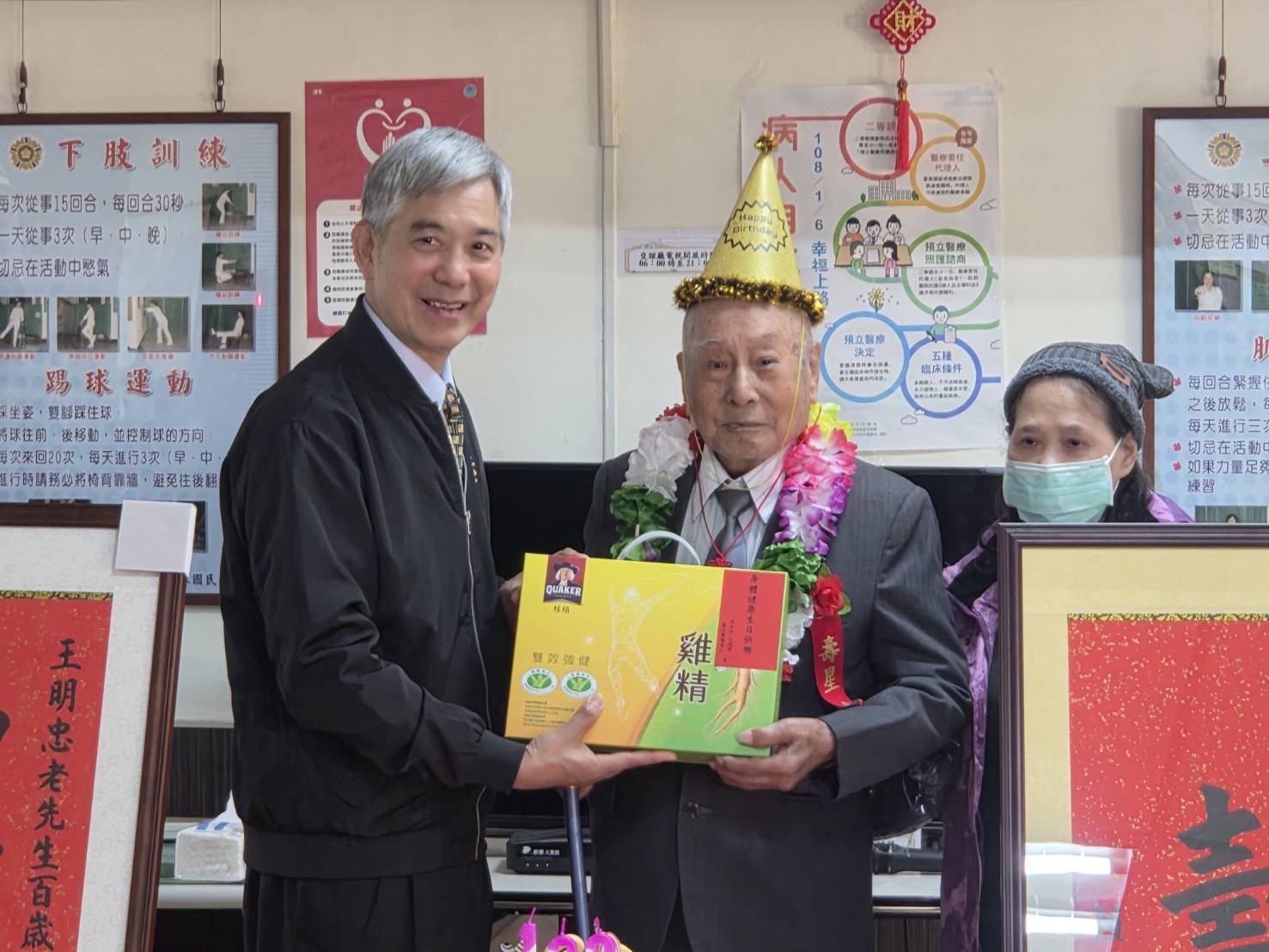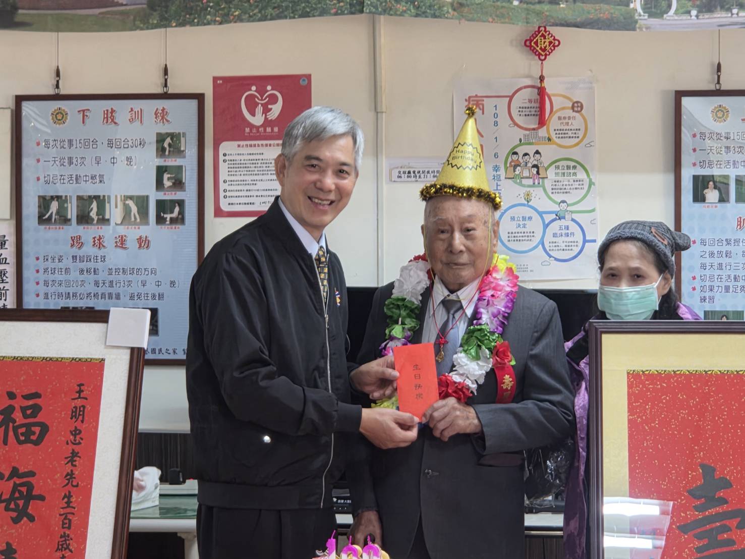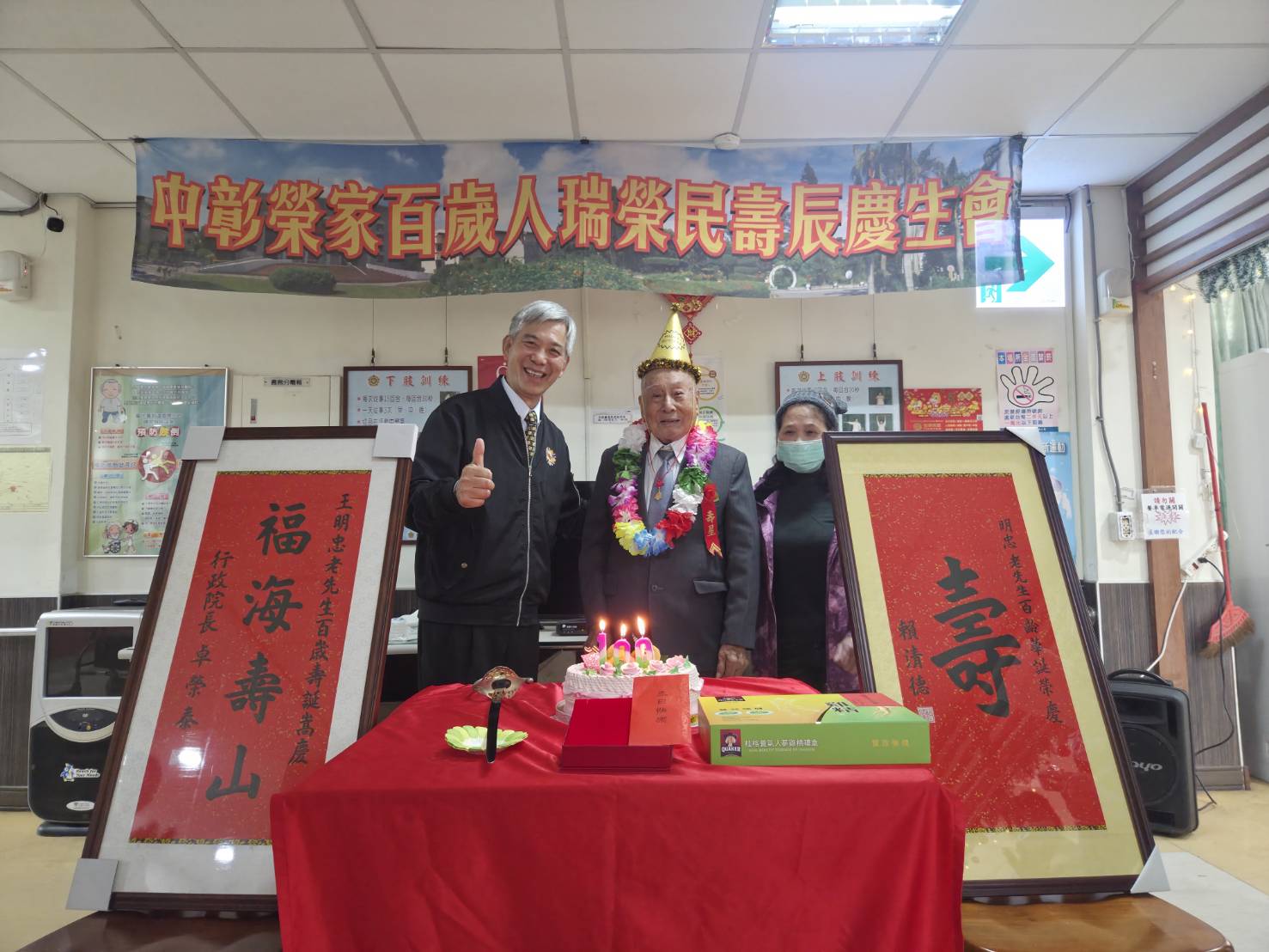 中彰榮家舉辦百歲慶生會 住民及家屬同賀福壽綿延 中彰榮家今(5)日辦理榮民王明忠伯伯百歲壽辰慶生會,同時也邀來了王伯伯的家屬一同為王伯伯祝壽,一起祝福王明忠伯伯天賜遐齡、福壽雙全。席間榮家主任呂德義除代表賴總統及行政院卓院長致贈百歲壽屏,也代表輔導會嚴德發主委致贈金壽桃項鍊,並轉達輔導會對於榮民長輩關懷慰問之美意。榮家更精心準備了百歲壽糕及營養品禮盒送給王伯伯補充元氣,在榮家服務團隊及親友的共同見證下,主任呂德義牽起王伯伯的手切下百歲壽糕,希望王伯伯的福氣能綿延中彰榮家,王伯伯喜悅之情溢於言表,他對這份特殊的關愛感到無比感激,他的百歲生日心願也期望榮家長輩們都能長壽健康、吉祥如意,慶生會充滿溫馨與歡樂的氣氛,與會家屬並感謝輔導會對功在國家的老榮民照顧之用心。 王明忠(下稱王伯) 民國16年2月5日出生,安徽省南凌縣人。15歲那年日軍進犯,戰爭逼到家鄉,年紀輕輕就被父母催著成婚,提前和未婚妻成親,2個孩子陸續出生,因戰爭方殷,20歲時應徵編入國軍第13軍,跟隨部隊參與抗日戰爭。參加過長沙會戰等大小戰爭,自述心裡常存:「我要活下去,活著回家鄉看妻小。」的念頭。抗戰勝利後,原以為可以回家鄉跟家人過生活,但國共戰爭開始,又跟著部隊與共軍作戰,隨國軍部隊由遼寧、唐山、葫蘆島、長沙、海南島等地四處轉戰,最後登上國軍接應的登陸艇到臺灣。由基隆港上岸後被整編到32軍,後因為射擊技術好,被選進總統府侍衛隊,在士林官邸當老蔣總統侍衛,維護官邸安全,同時也在臺灣娶妻、生子,享受美滿的家庭生活,服役至68年4月1日以陸軍上士光榮退役。退伍後到新竹尖石礦場挖煤,王伯回憶說那是最辛苦的時候,每天和石頭、煤灰打交道,全靠雙手賺錢存錢,但也就是靠著這份堅持,他在退伍後重新站穩腳步,開始過著人生的新生活,工作至78年間退休。後因年事已高,有感身體虛弱需人照料,雖有配偶與女兒陪伴,獲悉榮家對榮民全方位照顧,乃於107年9月11日入住本家安養。目前雖高齡百歲,體況尚可,個性謙沖和藹,平時在家區房舍附近走動及參加活動,與住民、工作人員相處融洽。 家主任呂德義表示,特別感謝總統府、行政院及輔導會對於榮家長輩的關心,相信長輩們接受這份暖心的賀禮,一定倍感溫馨。中彰榮家除致力提升住民的照顧服務品質,也持續串聯公益資源,與社會慈善團體一同努力,建構友善的長者照顧服務網絡