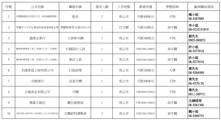 發布日期:115-02-03 資料來源:澎湖縣榮民服務處 【澎湖縣榮服處】廠商職缺表(115.02.02) 附件下載 檔案名稱 更新日期 下載次數 【澎湖縣榮服處】廠商職缺表(115.02.02).pdf 115-02-05 3