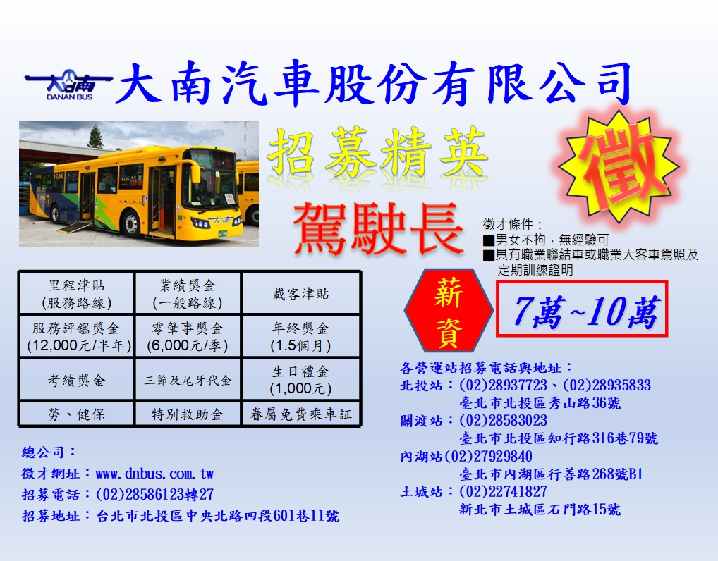📢 大南汽車股份有限公司誠徵駕駛長,歡迎榮民榮眷及第二類退除役官兵踴躍報名!