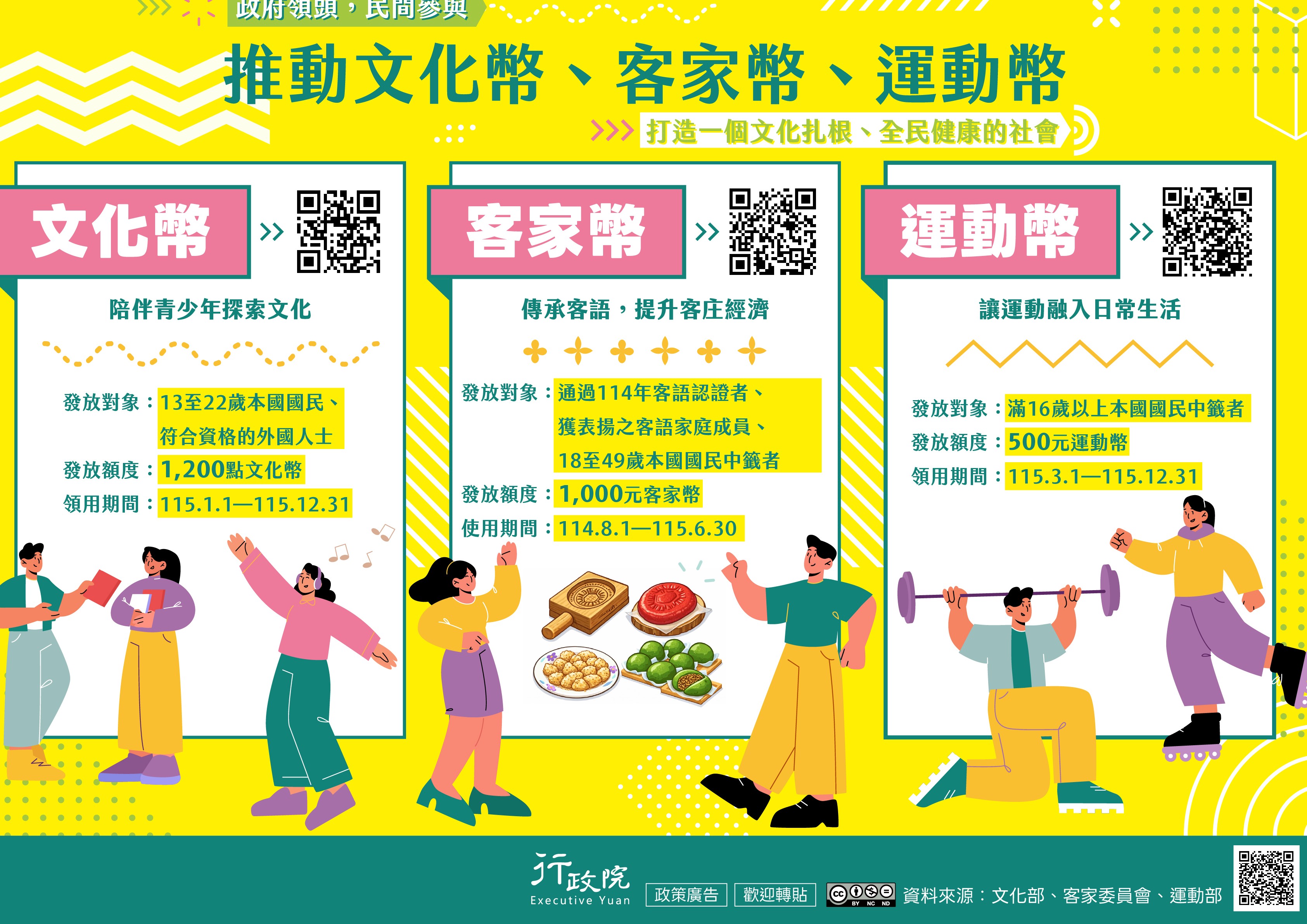 行政院長卓榮泰於行政院會聽取文化部、客家委員會及運動部「文化幣、客家幣、運動幣之執行規劃及成效」報告後表示,為鼓勵青少年踴躍參與藝文、運動等休閒活動,並促進相關產業發展,文化部於112年開始發行文化幣,使臺灣成為亞洲第一個推動文化禮金政策的國家;客委會亦於去(114)年8月推動客家幣,而運動部將於今(115)年把「青春動滋券」轉型為「運動幣」,並擴大發放對象。