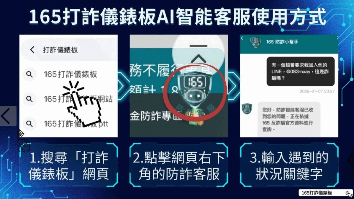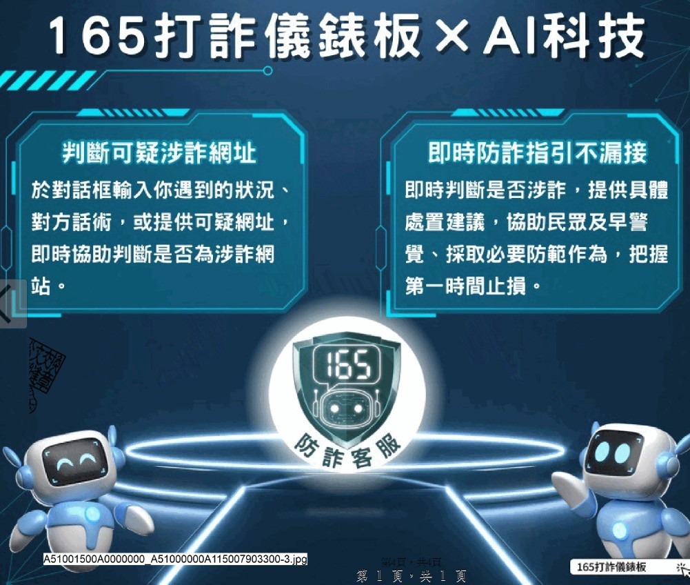 因應詐騙手法快速演變,內政部警政署於「165打詐儀錶板」導入AI智能客服小幫手,整合防詐資料庫提供即時互動諮詢