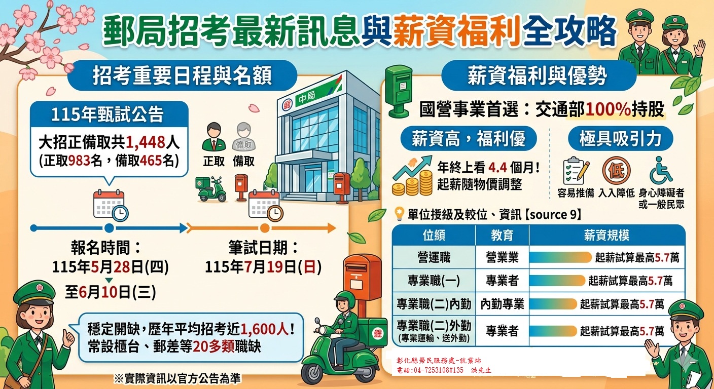 郵局招考公告最新簡章!大招正備取共1,448人(正取983名,備取465名)於115年5月28日(四) 至6月10日(三)開放報名,115年7月19日(日)筆試。