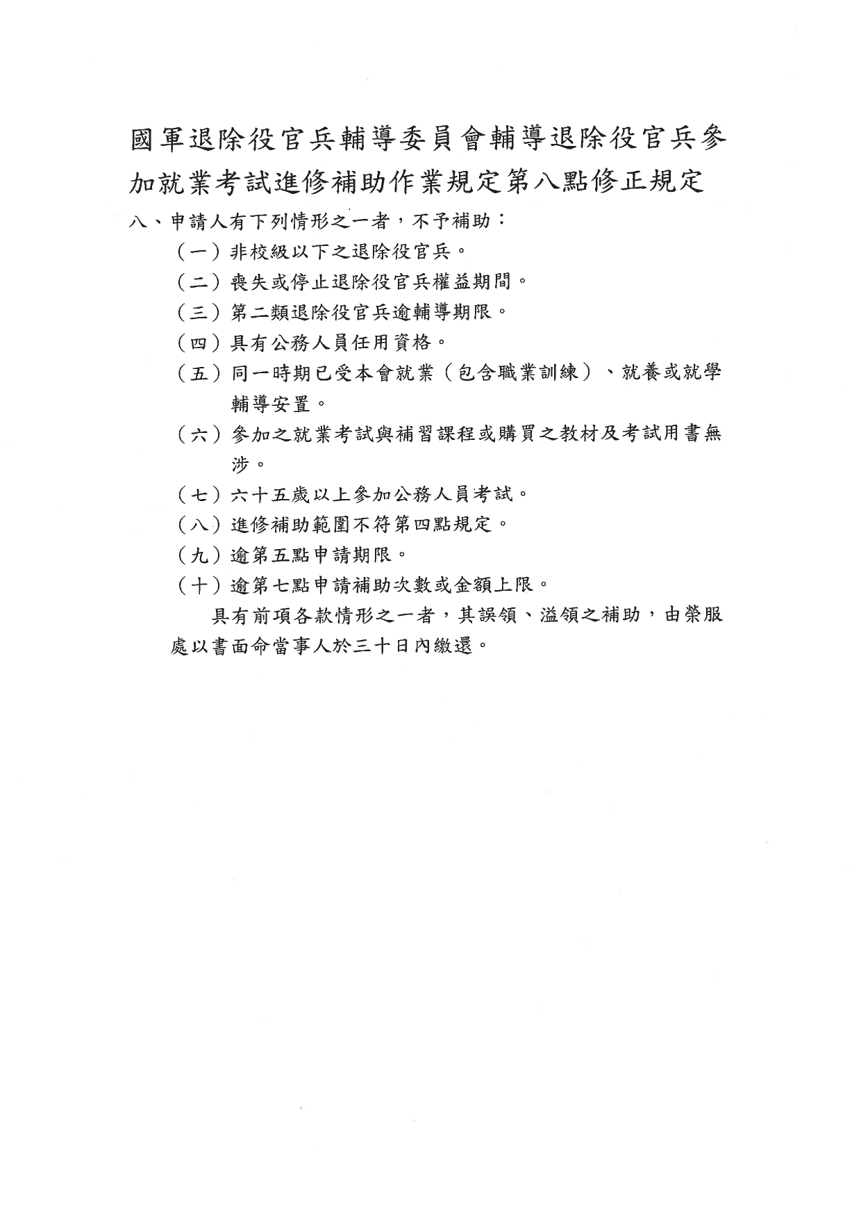 本會「國軍退除役官兵輔導委員會輔導退除役官兵參加就業考試進修補助作業規定」第八點修正規定,自115年1月1日起生效。