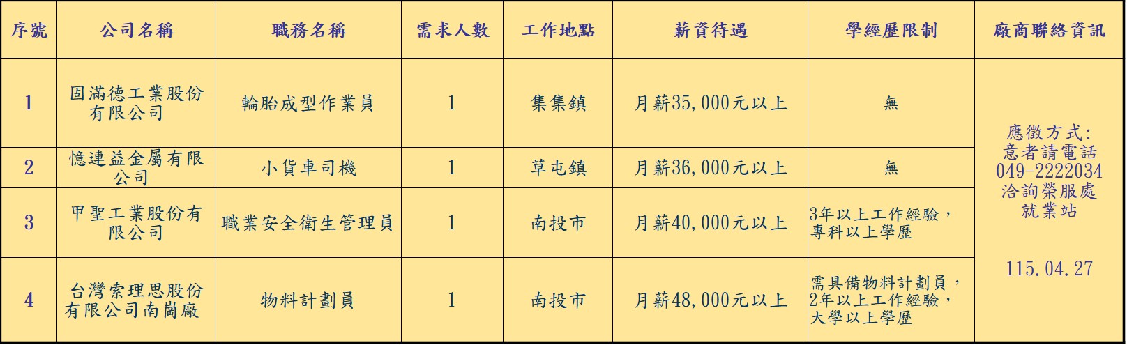 發布日期:115-04-27 資料來源:南投縣榮民服務處 【南投榮服處】廠商職缺表(115.04.27) 附件下載 檔案名稱 更新日期 下載次數 【南投榮服處】廠商職缺表(115.04.27).pdf 115-04-27 3