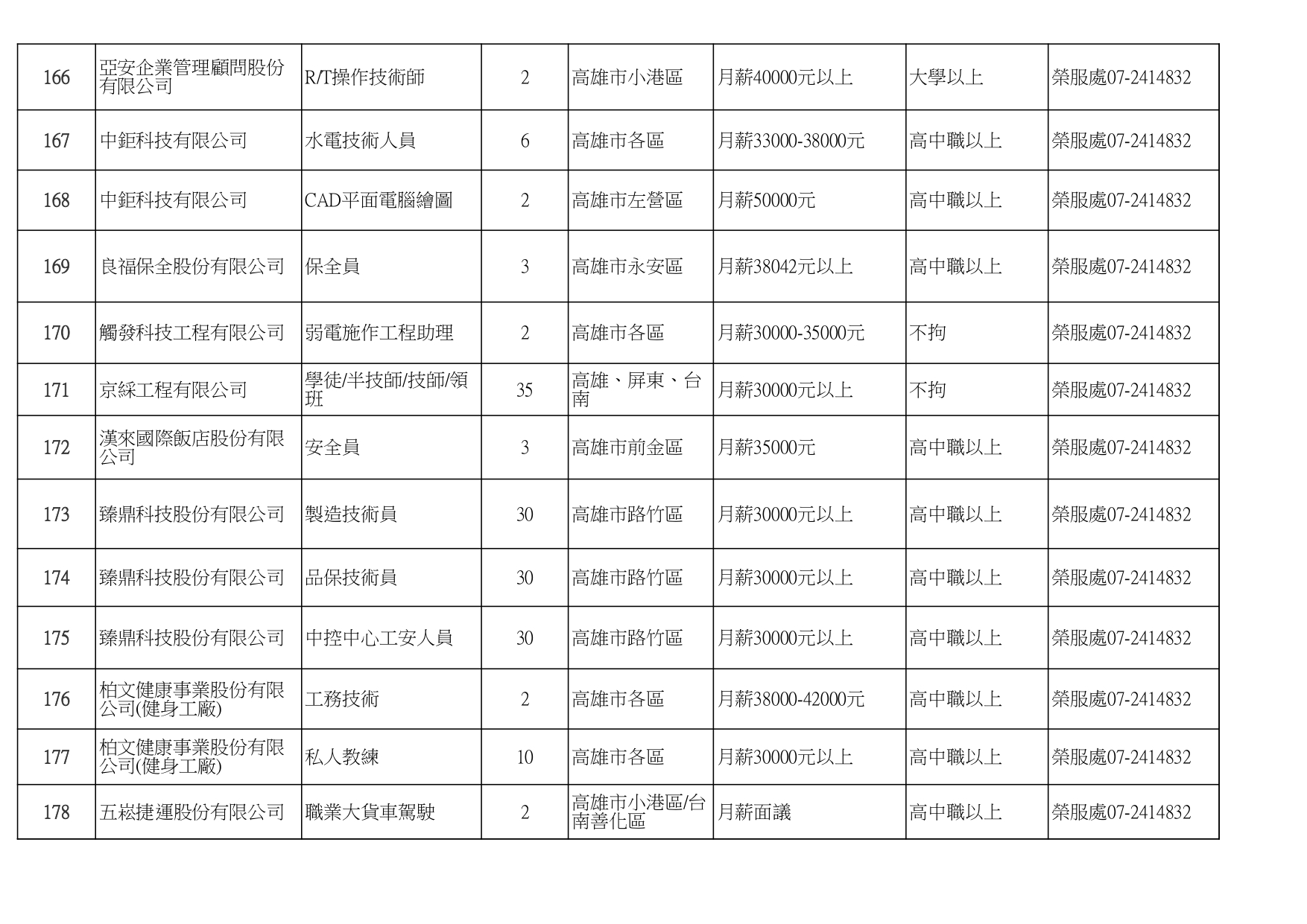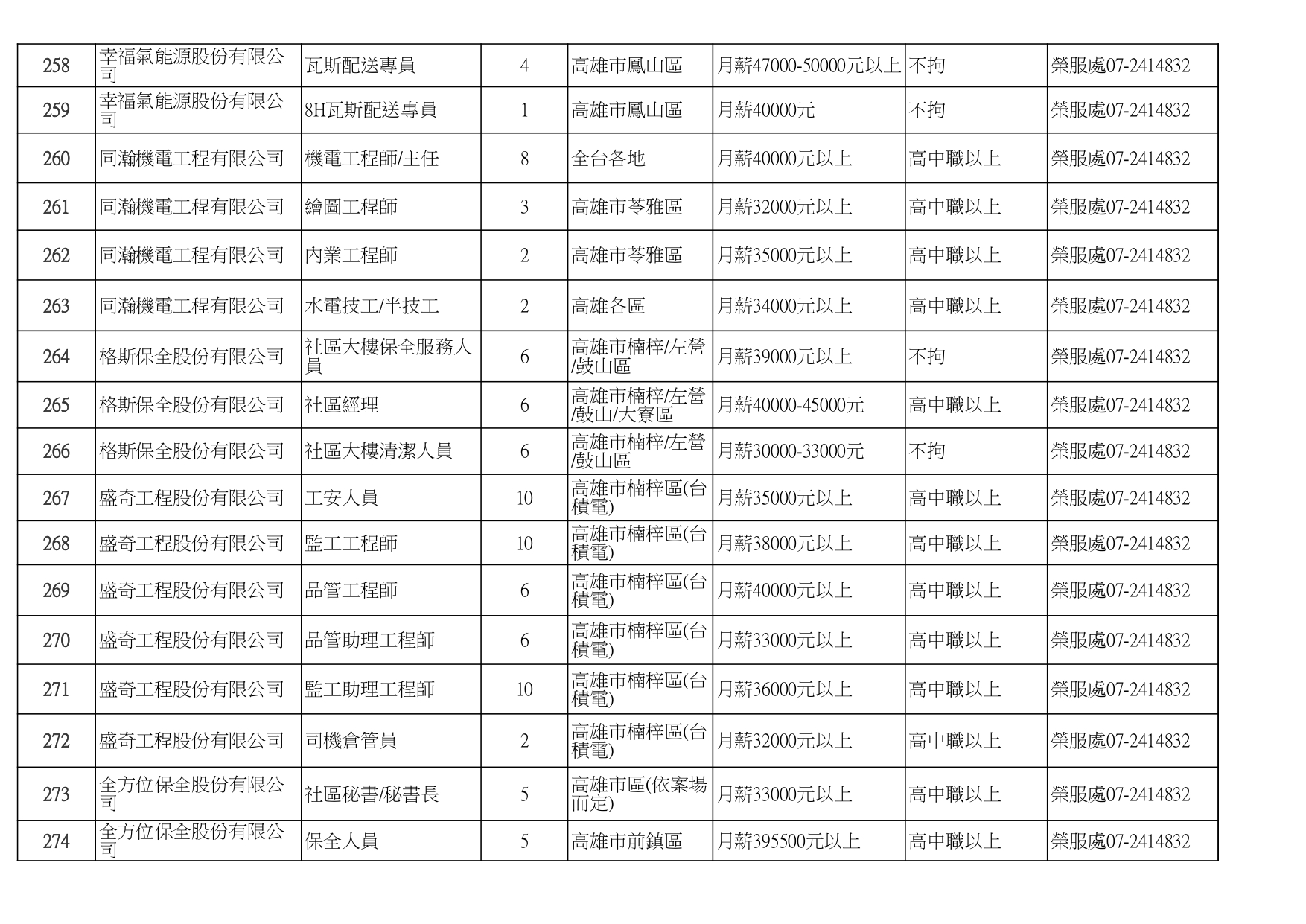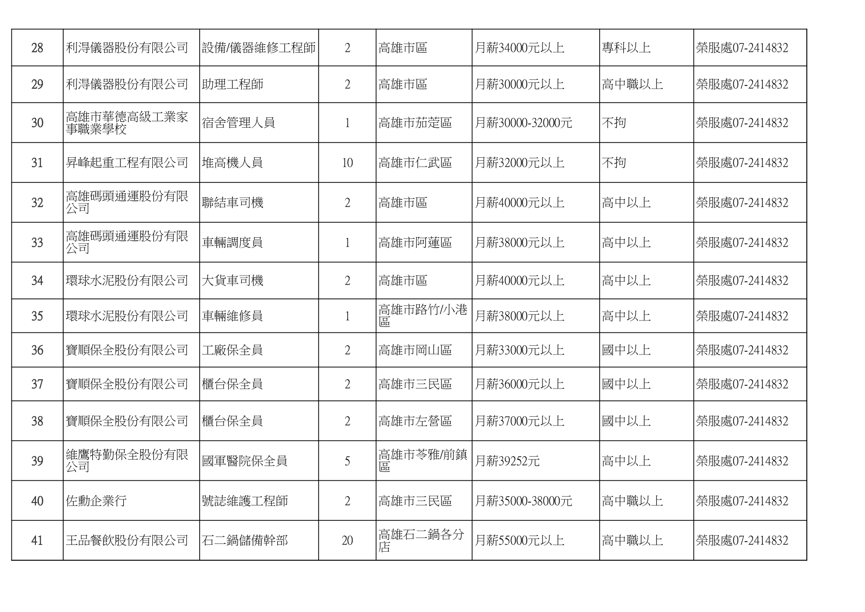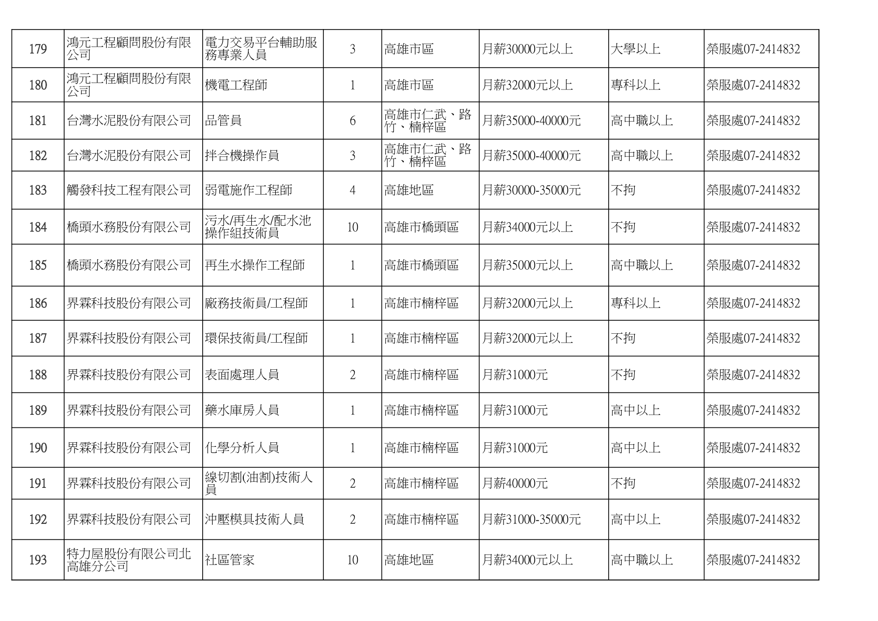 發布日期:115-01-16 資料來源:高雄市榮民服務處 高雄榮服處-廠商職缺列表115.1.16_page-0001有就業需求之退除役官兵,請把握機會! 如有就(轉)業需求,歡迎洽詢本處就業站(07-2414832) 相關照片 高雄榮服處-廠商職缺列表115.1.16_page-0002 高雄榮服處-廠商職缺列表115.1.16_page-0003 高雄榮服處-廠商職缺列表115.1.16_page-0004 高雄榮服處-廠商職缺列表115.1.16_page-0005 高雄榮服處-廠商職缺列表115.1.16_page-0006 高雄榮服處-廠商職缺列表115.1.16_page-0007 高雄榮服處-廠商職缺列表115.1.16_page-0008 高雄榮服處-廠商職缺列表115.1.16_page-0009 高雄榮服處-廠商職缺列表115.1.16_page-0010 高雄榮服處-廠商職缺列表115.1.16_page-0011 高雄榮服處-廠商職缺列表115.1.16_page-0012 高雄榮服處-廠商職缺列表115.1.16_page-0013 高雄榮服處-廠商職缺列表115.1.16_page-0014 高雄榮服處-廠商職缺列表115.1.16_page-0015 高雄榮服處-廠商職缺列表115.1.16_page-0016 高雄榮服處-廠商職缺列表115.1.16_page-0017 高雄榮服處-廠商職缺列表115.1.16_page-0018 高雄榮服處-廠商職缺列表115.1.16_page-0019 高雄榮服處-廠商職缺列表115.1.16_page-0020 附件下載 檔案名稱 更新日期 下載次數 高雄榮服處-廠商職缺列表115.1.16.pdf 115-01-16 7