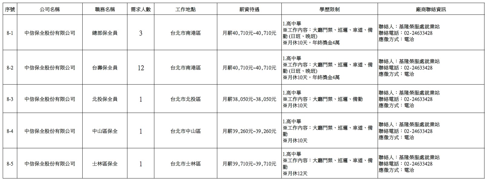 發布日期:115-03-10 資料來源:基隆市榮民服務處 【基隆市榮服處】廠商職缺表(115.03.10)-1 相關照片 【基隆市榮服處】廠商職缺表(115.03.10)-2 【基隆市榮服處】廠商職缺表(115.03.10)-3 【基隆市榮服處】廠商職缺表(115.03.10)-4 【基隆市榮服處】廠商職缺表(115.03.10)-5 【基隆市榮服處】廠商職缺表(115.03.10)-6 【基隆市榮服處】廠商職缺表(115.03.10)-7 【基隆市榮服處】廠商職缺表(115.03.10)-8 附件下載 檔案名稱 更新日期 下載次數 【基隆市榮服處】廠商職缺表(115.03.10).pdf 115-03-10 8