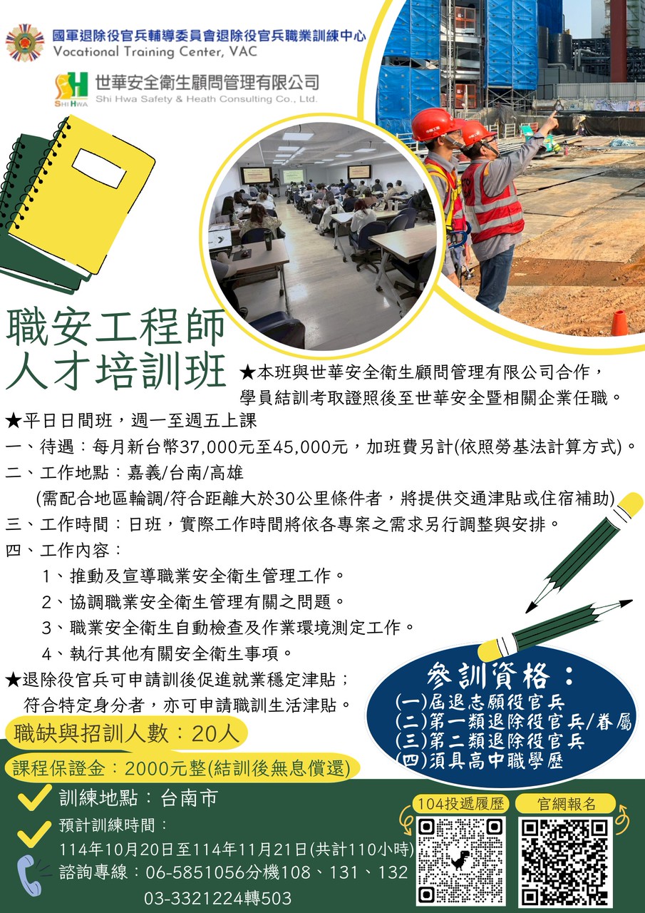 【輔導會產訓合作班】職安工程師人才培訓班開放報名!!