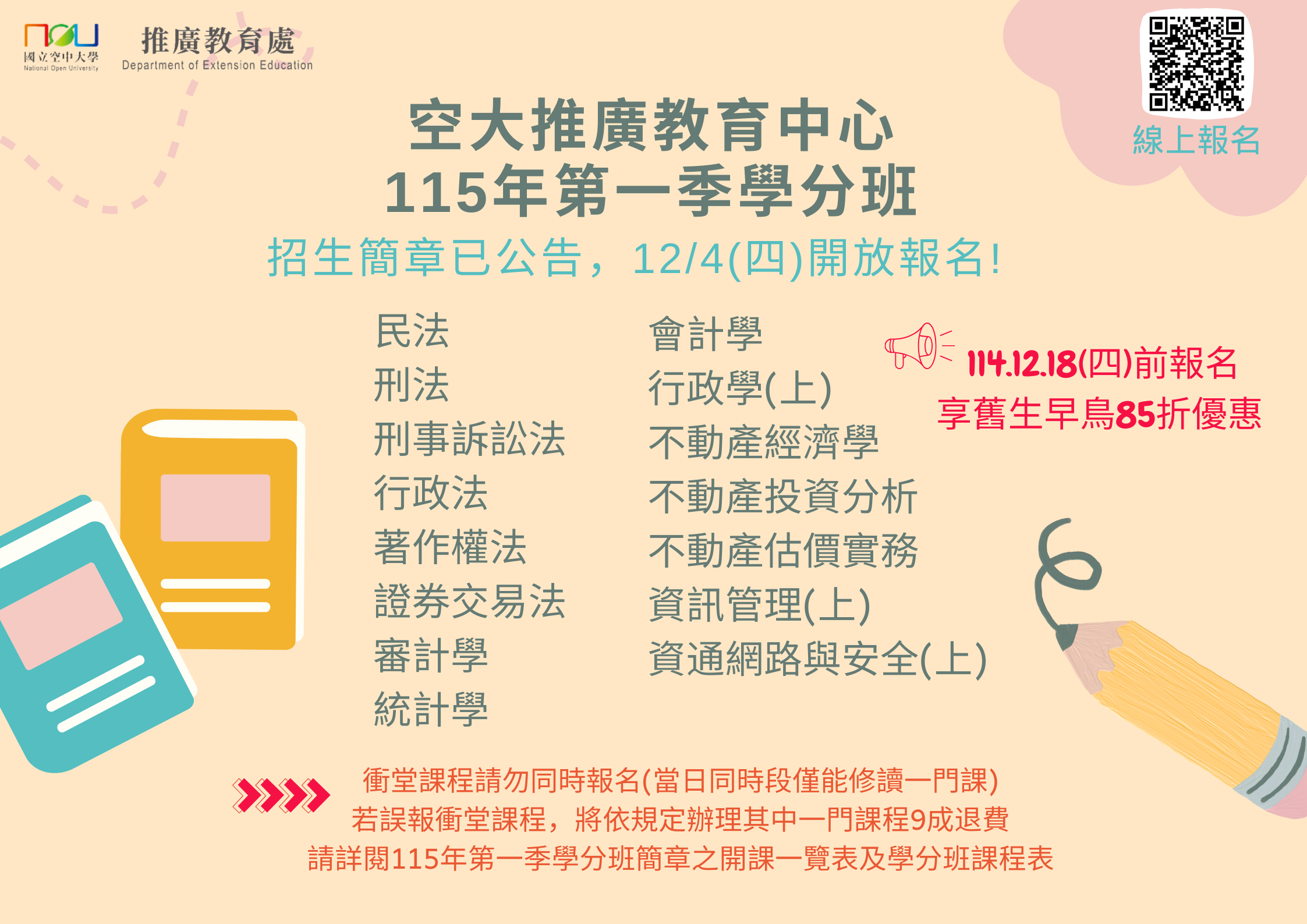 【大專校院進修補助課程資訊】:國立空中大學115年第一季學分班開放報名中!熱烈招生!