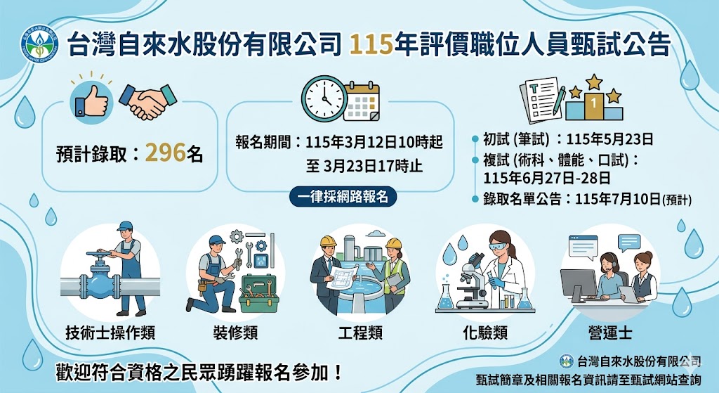 台灣自來水股份有限公司115年評價職位人員甄試公告