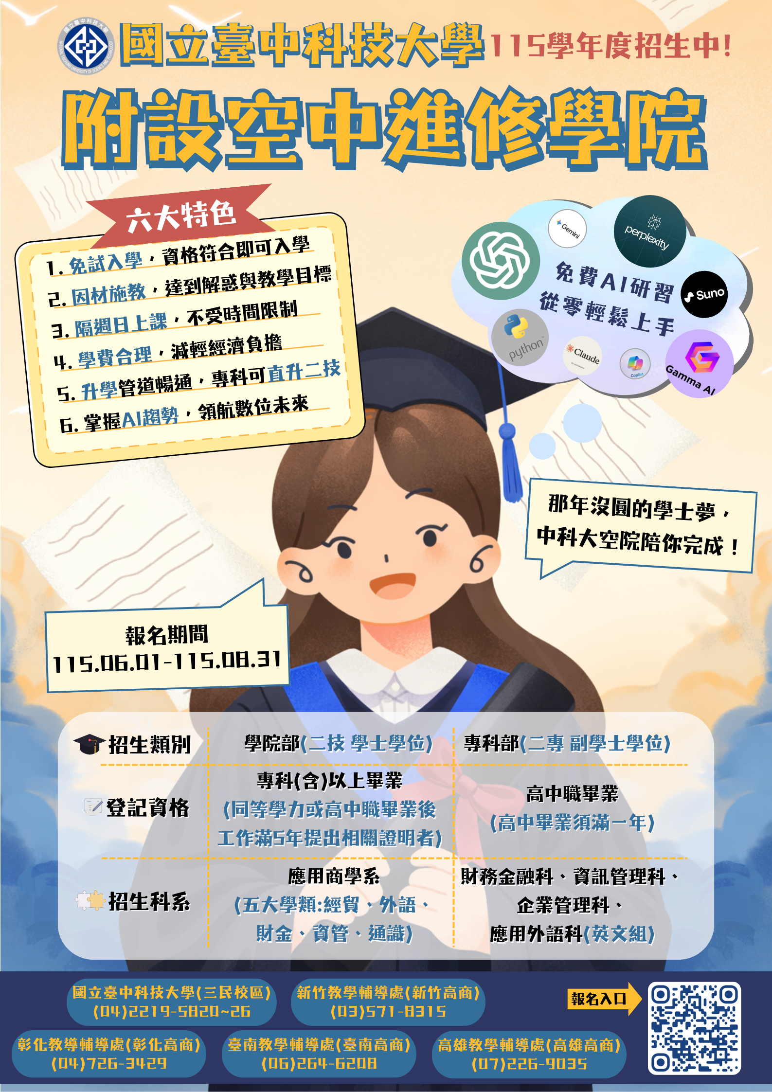 🎓 國立臺中科技大學附設空中進修學院 115年度招生開跑!