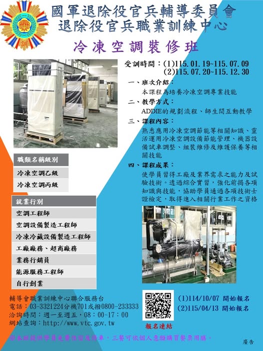 【職訓快訊】退輔會職訓中心 自辦 日間養成班 115年度 冷凍空調裝修班