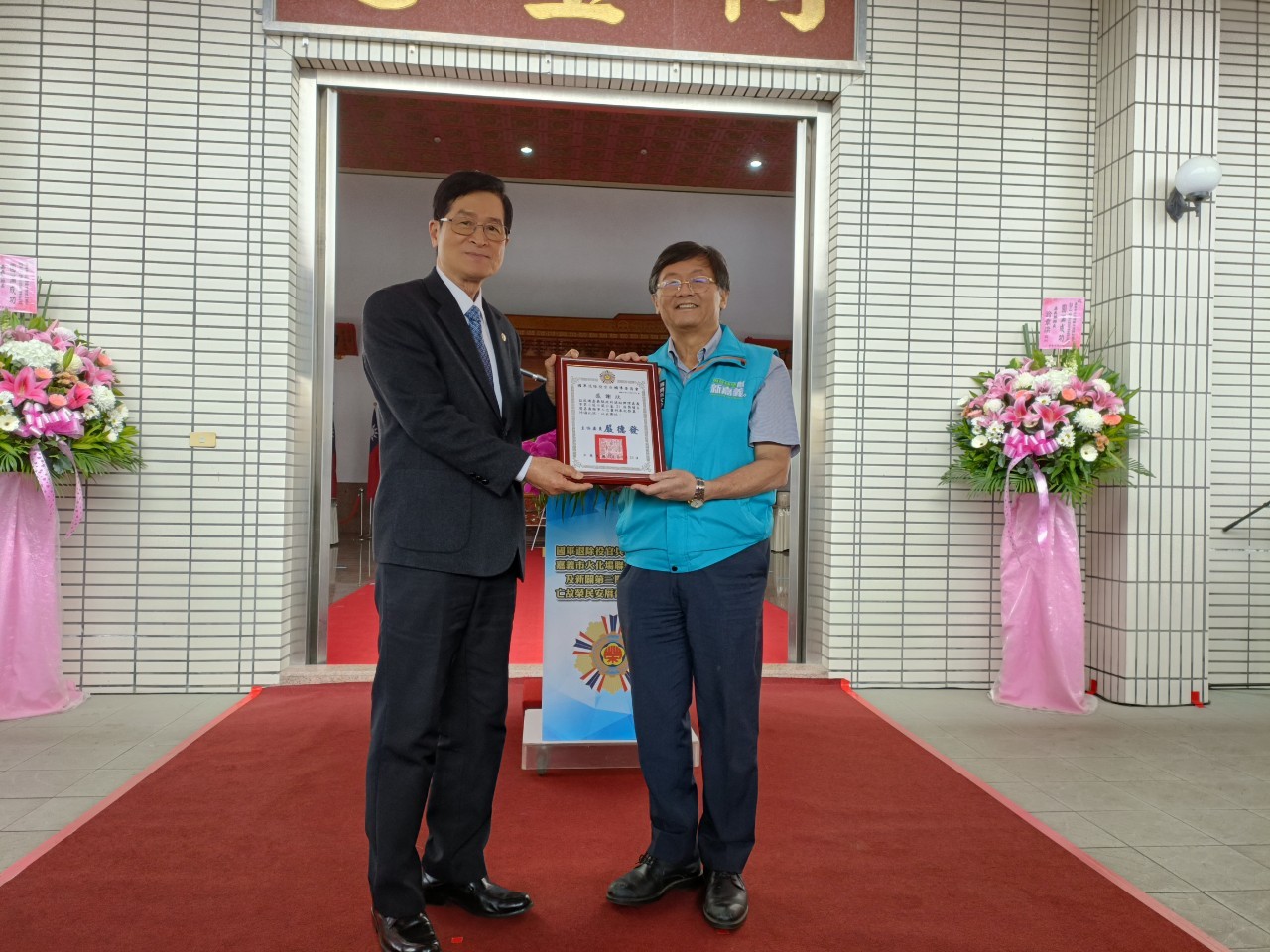 為感謝本次安厝典禮順利功成,主任委員除頒發感謝狀給嘉義縣政府及嘉義市政府,感謝地方政府共同努力協助,同時亦頒發感謝狀給愛爾麗醫美集團總裁常如山及總經理劉貞華、欣雲天然氣股份有限公司林裕盟董事長、欣嘉石油氣股份有限公司黃金財董事長、大台南天然氣股份有限公司洪過董事長及鑫豐生命事業有限公司,肯定其善行義舉、熱心公益,成就安厝英靈的功德。
