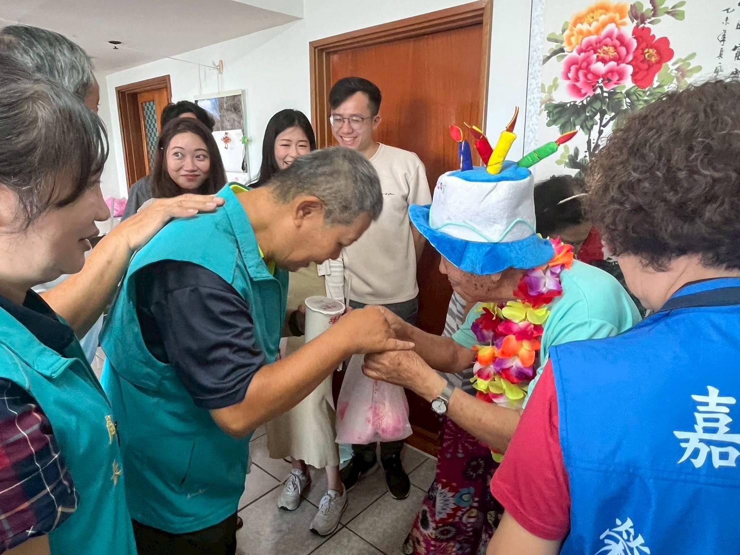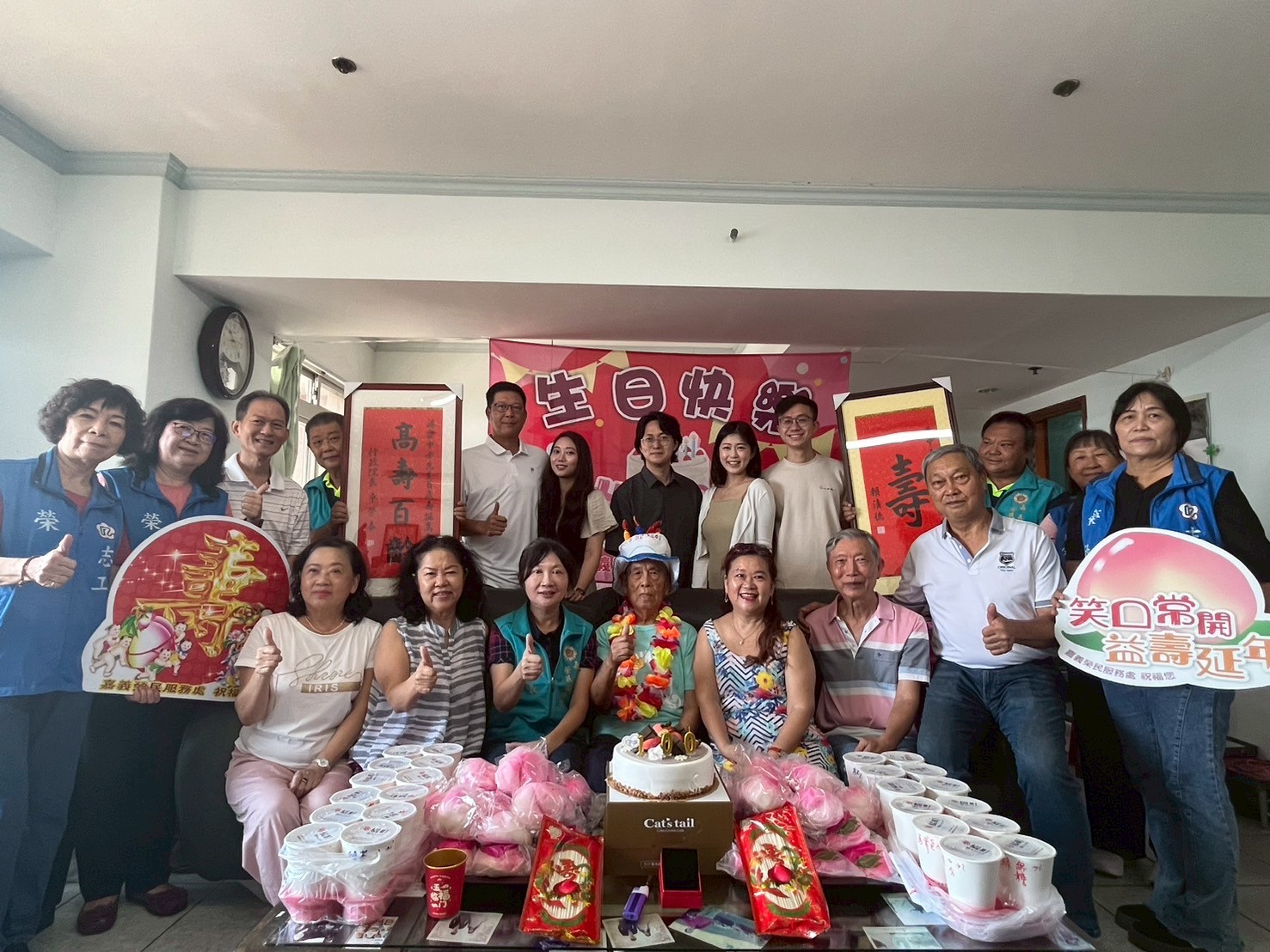 居住在嘉義市西區的榮民薄伯伯歡喜慶百歲,嘉義榮服處處長許淑菁特率責任區輔導員、社區志願服務組長、替代役及榮欣志工們,偕同嘉義市西區翠岱里陳金虎里長一同到場道賀,與薄伯伯一家人共同歡慶百歲壽辰,祝福長輩身體康健。