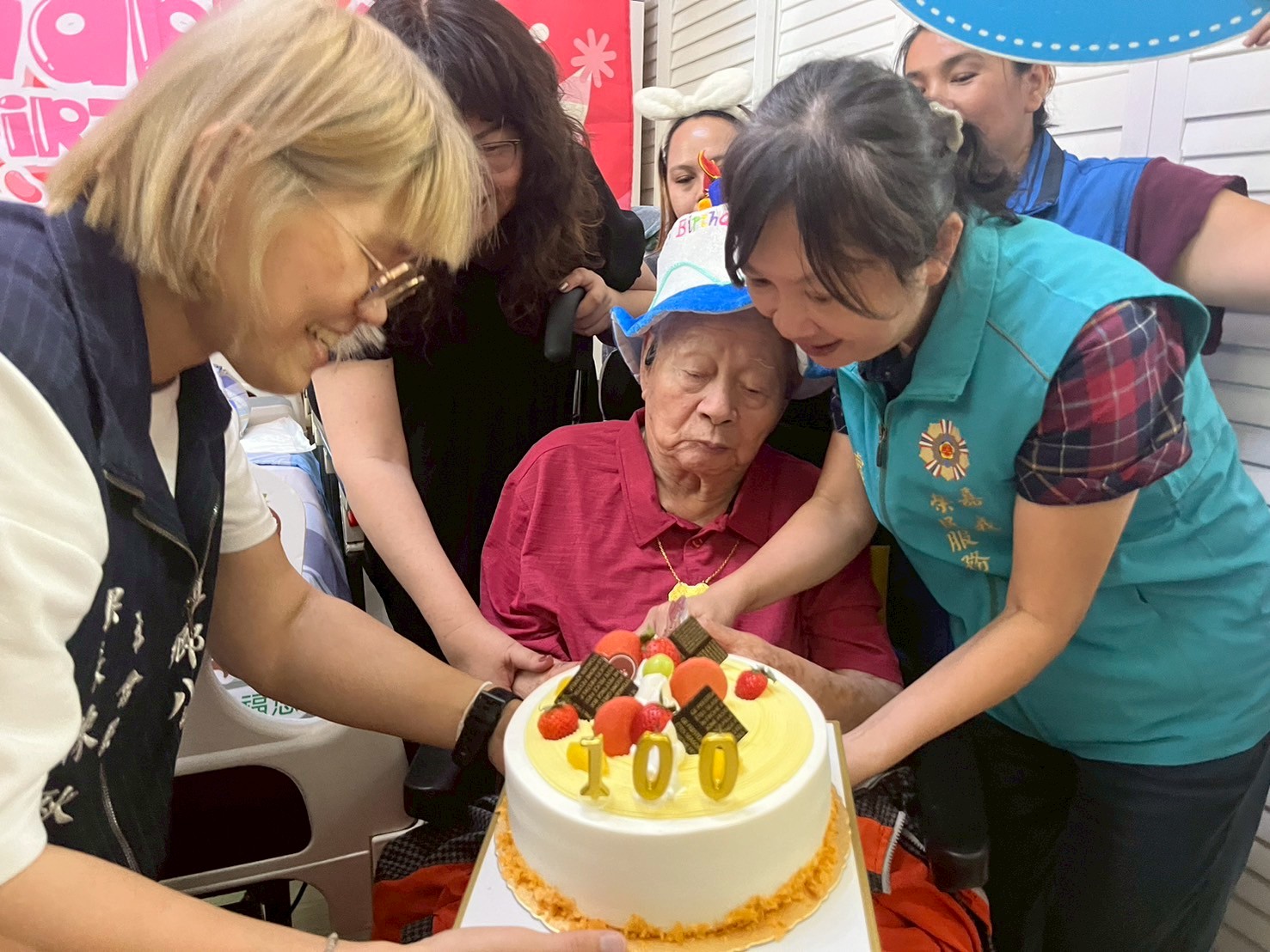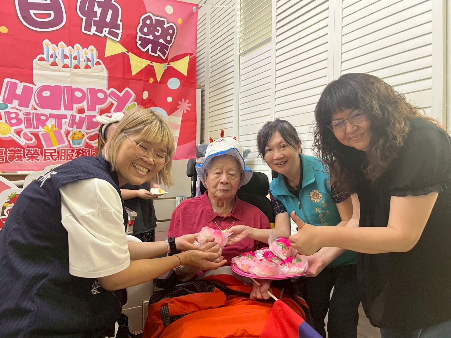 朱伯伯是湖北省均縣人,早年隨部隊來臺,於民國44年陸軍上士退役後,安置到中油高雄煉油廠工作,後續經相親結識配偶成家,子女皆事業有成、孝順;朱伯伯目前與女兒同住,由外籍看護照顧生活起居,女兒表示父親很喜歡閱讀,也總會說著自己過往在第十兵團服役、住過民雄。慶生過程中,嘉義縣民雄鄉公所代表社會課陳課長與鄭村長也都紛紛獻上對長輩的祝福,大夥一同齊唱生日快樂歌,一同祝賀長輩身體康泰、福壽綿延,其女兒也分送榮服處準備的壽桃給大家,讓大家歡樂滿滿。