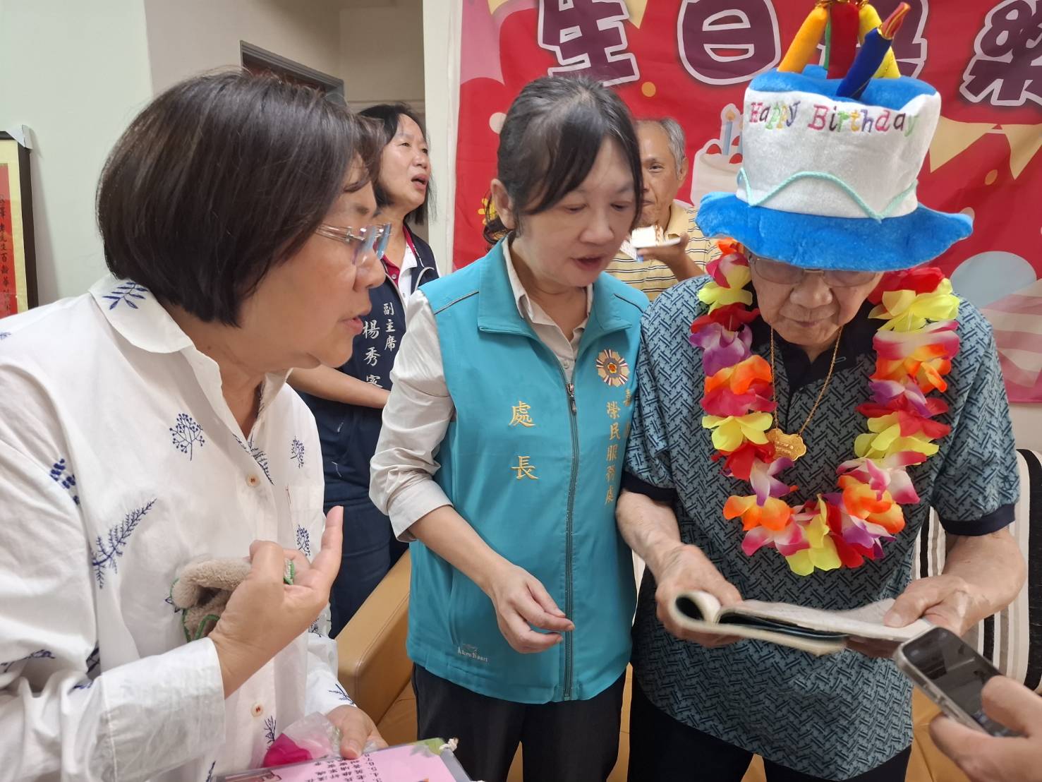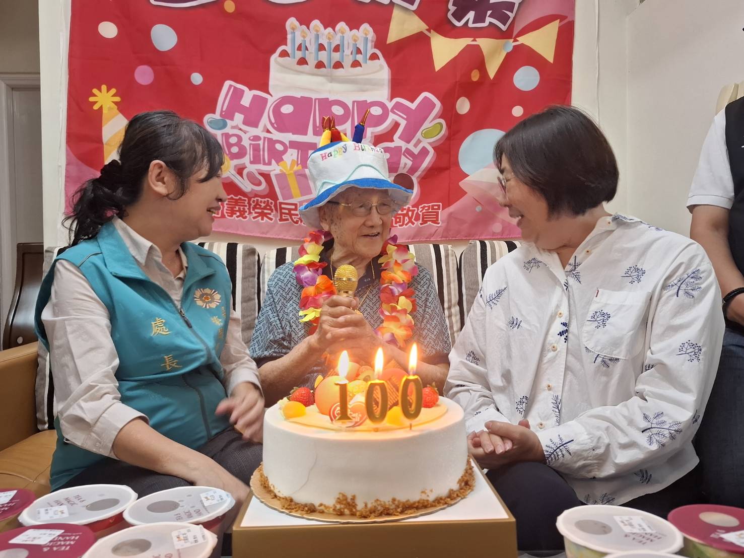 嘉義榮服處為居住在嘉義縣民雄鄉的榮民唐伯伯歡喜賀嵩壽,由處長許淑菁特率社區志願服務組長、替代役及榮欣志工們,偕同嘉義縣民雄鄉公所林于玲鄉長、簡嘉億議員、民雄鄉民代表會楊秀密副主席、社會課陳秋蓉課長及東榮村張金富村長到長輩家中賀壽,與唐伯伯與子女、女婿們共同歡慶唐伯伯百歲壽辰,氣氛溫馨。