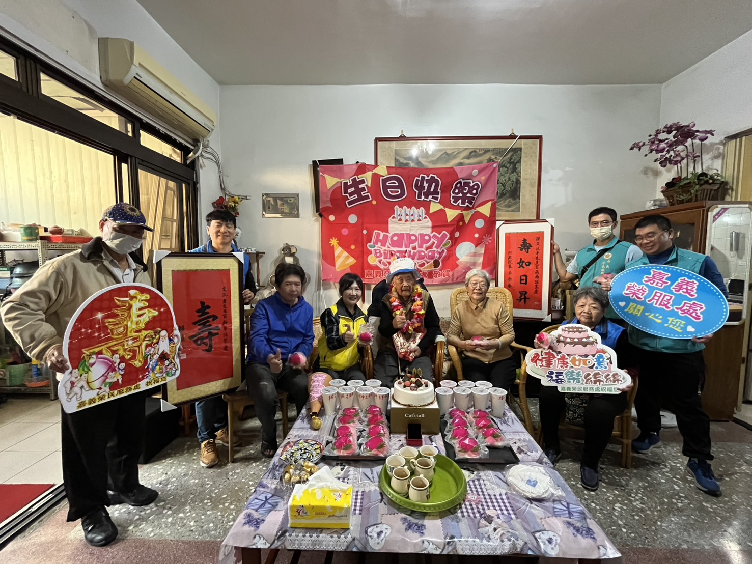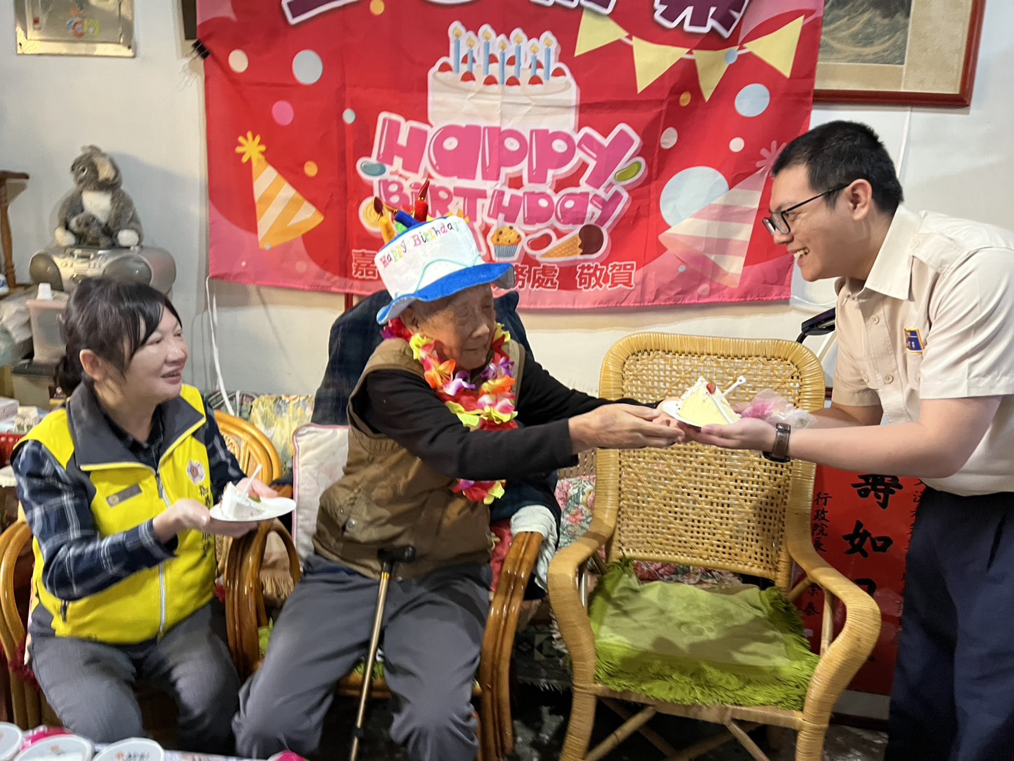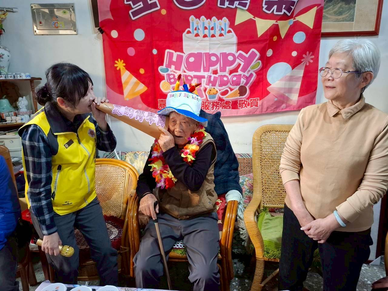 嘉義榮服處許處長感佩孫伯伯早年從功報勳、對國家的貢獻,並特別與長輩合唱「甜蜜蜜」歌曲。許處長也轉贈總統賴清德、行政院長卓榮泰的賀壽壽屏獻上祝福,並代退輔會嚴德發主任委員致贈孫伯伯百歲賀壽金飾,慶生活動在感動氣氛中圓滿結束。