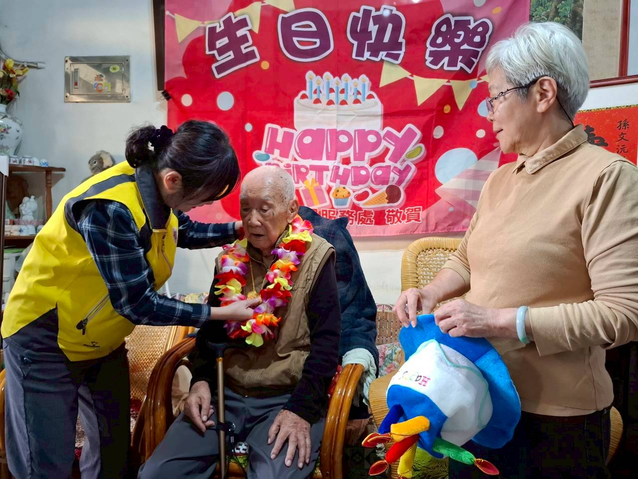 嘉義榮服處為居住在嘉義縣水上鄉的榮民孫文沅伯伯歡喜賀嵩壽,由處長許淑菁特率社區志願服務組長、替代役及榮欣志工們,偕同嘉義縣水上鄉民生村吳彥騰村長到長輩家中賀壽,與孫伯伯與女兒共同歡慶孫伯伯百歲壽辰,氣氛溫馨。