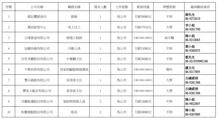 發布日期:115-01-26 資料來源:澎湖縣榮民服務處 【澎湖縣榮服處】廠商職缺表(115.01.26) 附件下載 檔案名稱 更新日期 下載次數 【澎湖縣榮服處】廠商職缺表(115.01.26).pdf 115-01-27 5