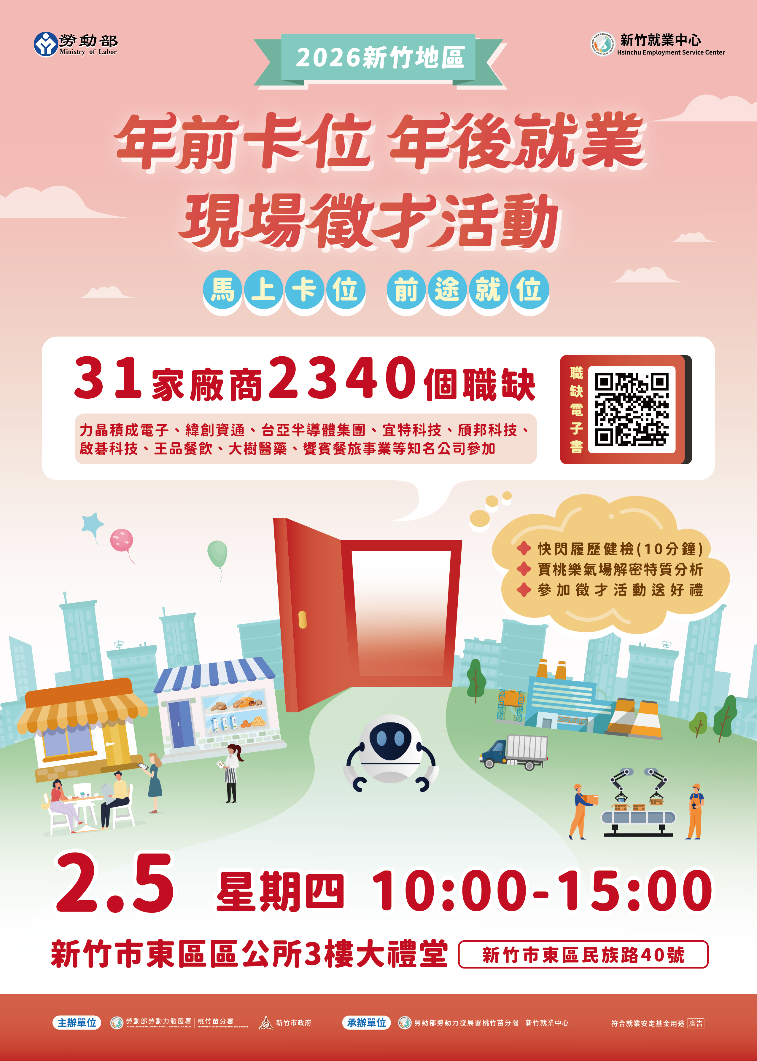 勞動部新竹就業中心115/2/5(四)10時至15時辦理「年前卡位,年後就業」現場徵才活動