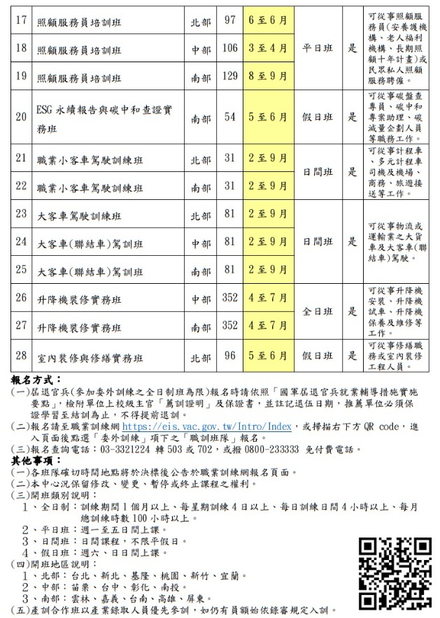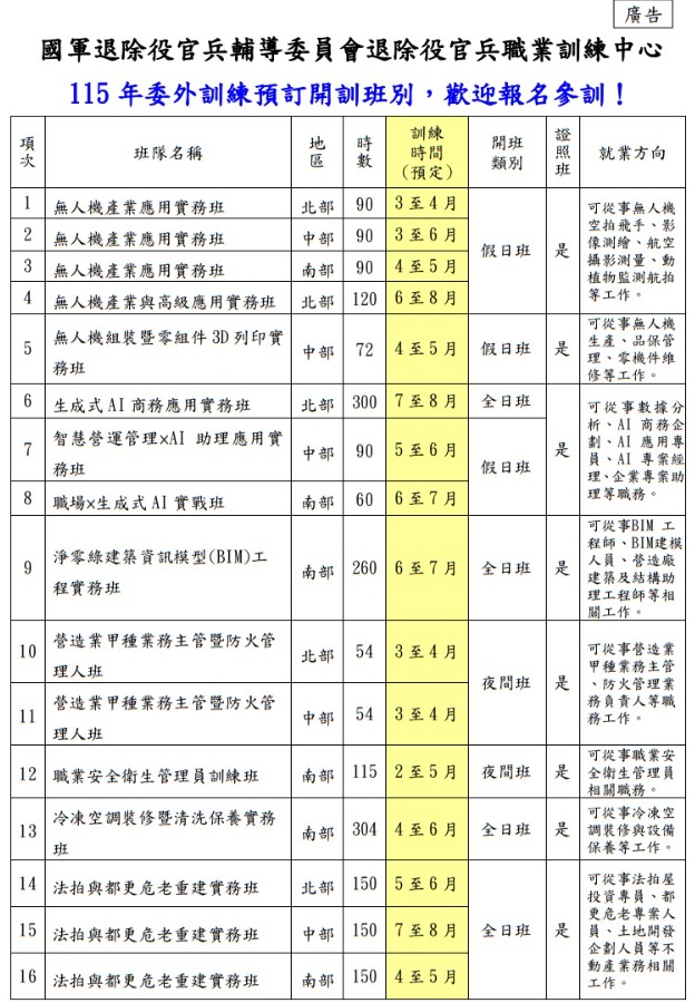 ~~課程內容豐富,歡迎屆退官兵、榮民(眷)、二類官兵報名~~