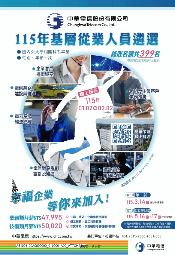 【就業考試快訊】~~中華電信115 年基層從業人員遴選~~