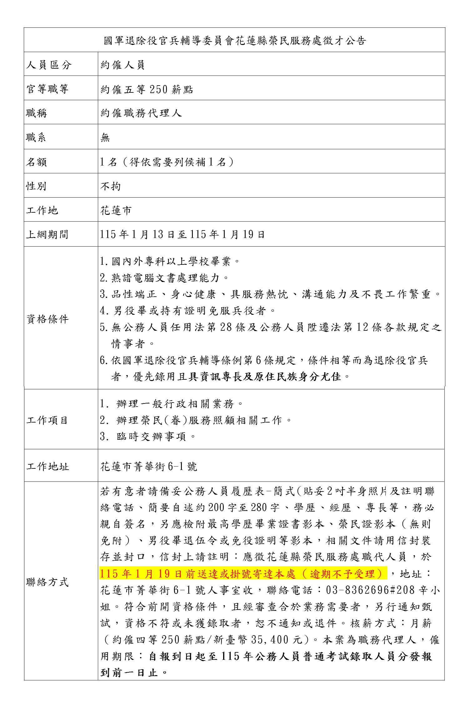 花蓮縣榮民服務處約僱職務代理人1150113-0119