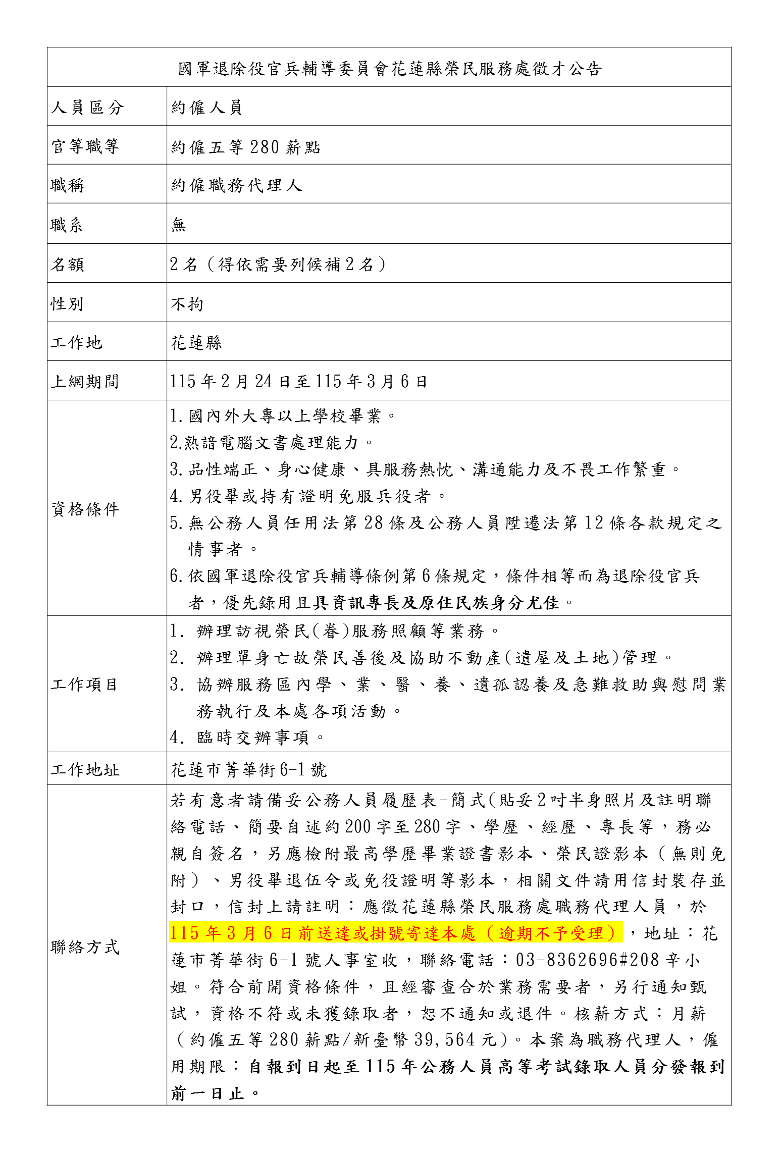 若有意者請備妥公務人員履歷表-簡式(貼妥2吋半身照片及註明聯絡電話、簡要自述約200字至280字、學歷、經歷、專長等,務必親自簽名,另應檢附最高學歷畢業證書影本、榮民證影本(無則免附)、男役畢退伍令或免役證明等影本,相關文件請用信封裝存並封口,信封上請註明:應徵花蓮縣榮民服務處職務代理人員,於115年3月6日前送達或掛號寄達本處(逾期不予受理),地址:花蓮市菁華街6-1號人事室收,聯絡電話:03-8362696#208辛小姐。符合前開資格條件,且經審查合於業務需要者,另行通知甄試,資格不符或未獲錄取者,恕不通知或退件。核薪方式:月薪(約僱五等280薪點/新臺幣39,564元)。本案為職務代理人,僱用期限:自報到日起至115年公務人員高等考試錄取人員分發報到前一日止。