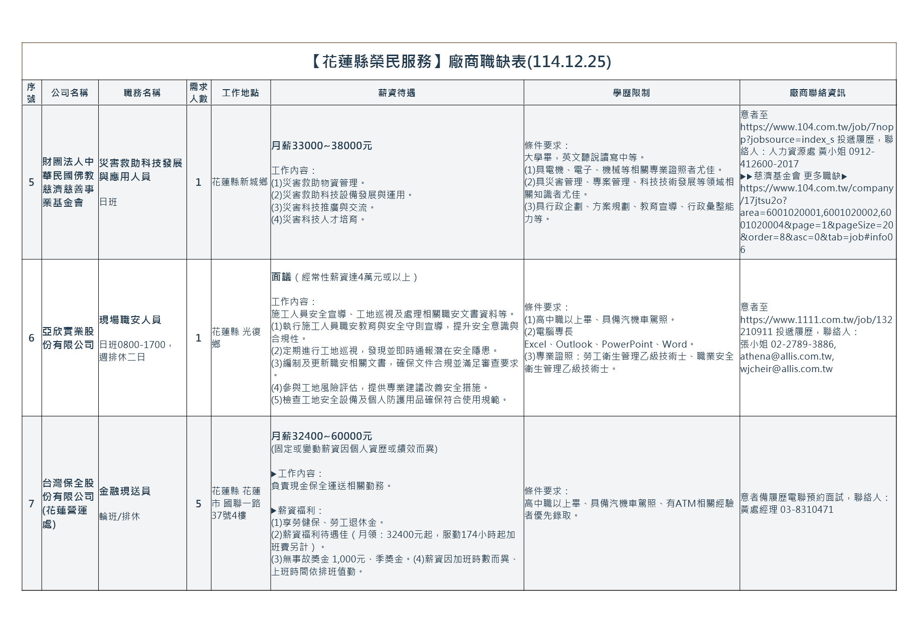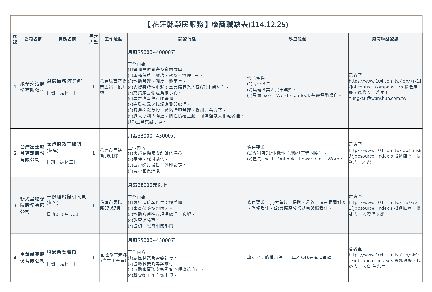【花蓮縣榮民服務處】廠商職缺表(114.12.25)