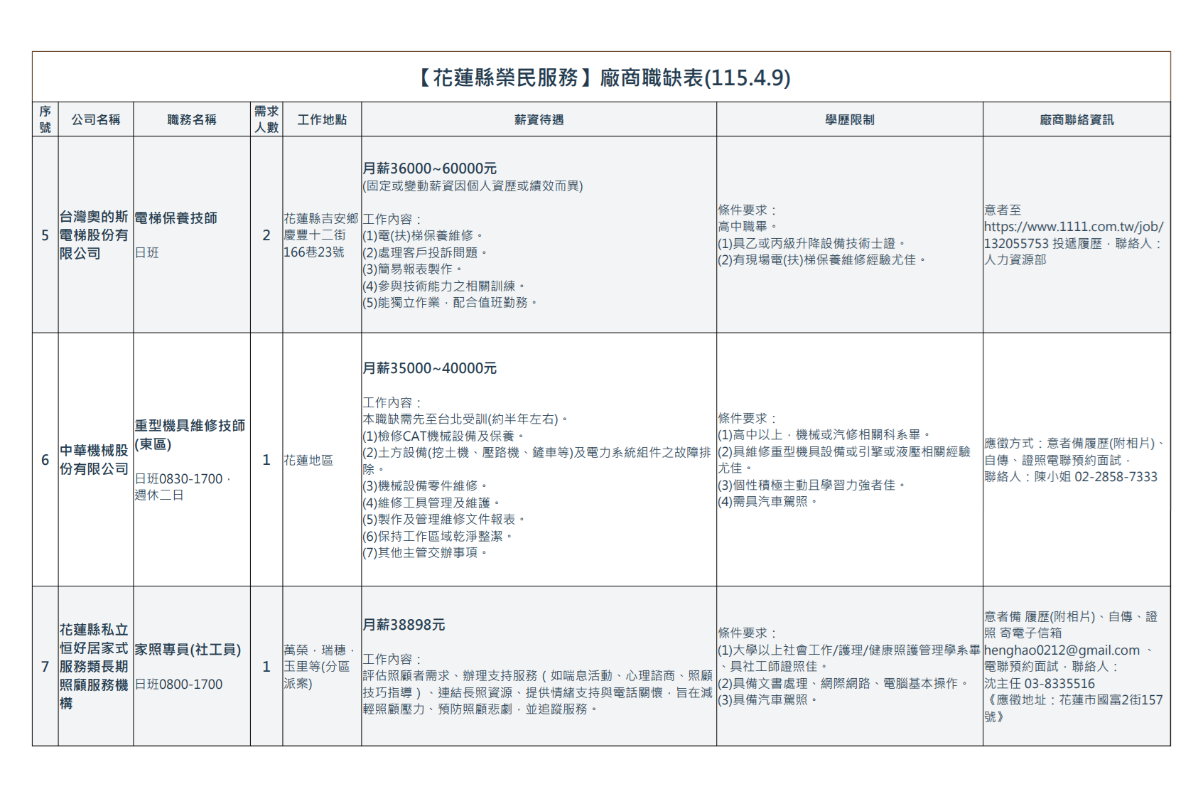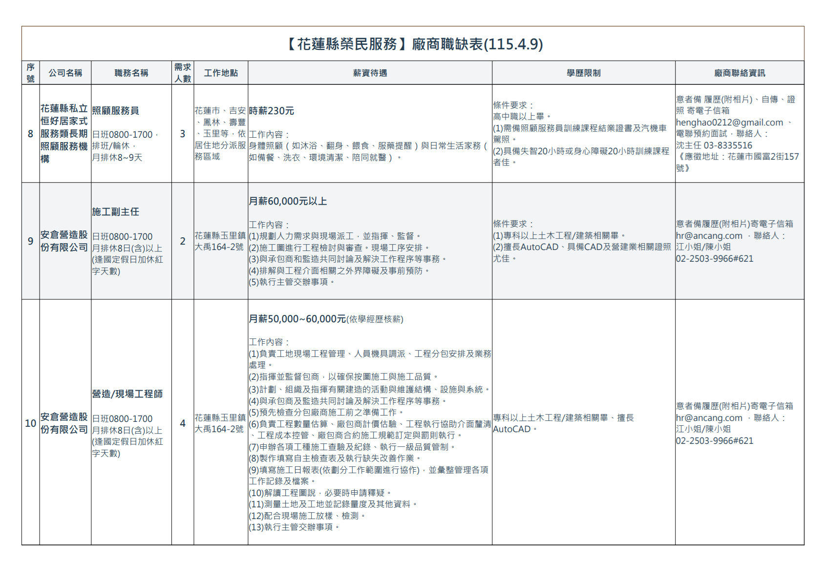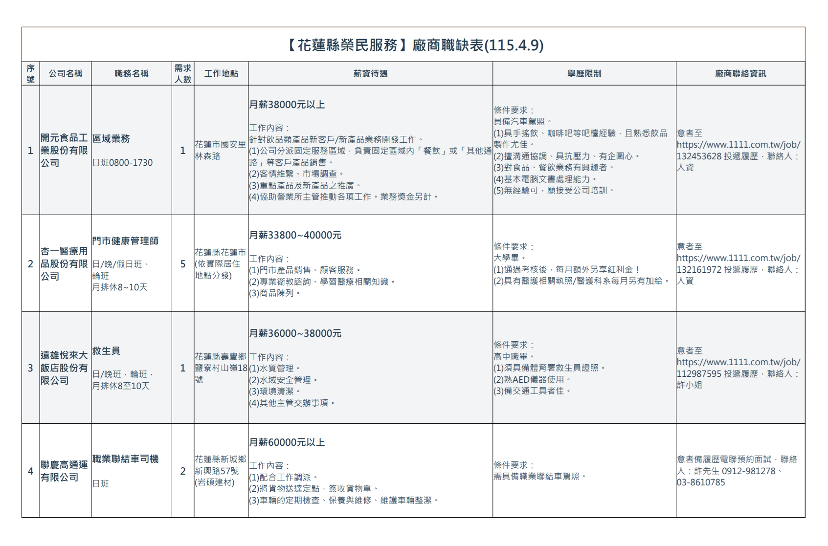 【花蓮縣榮民服務處】廠商職缺表(115.4.9)