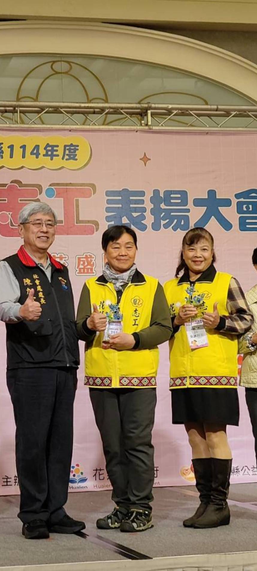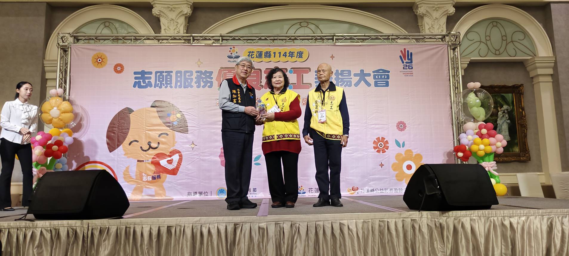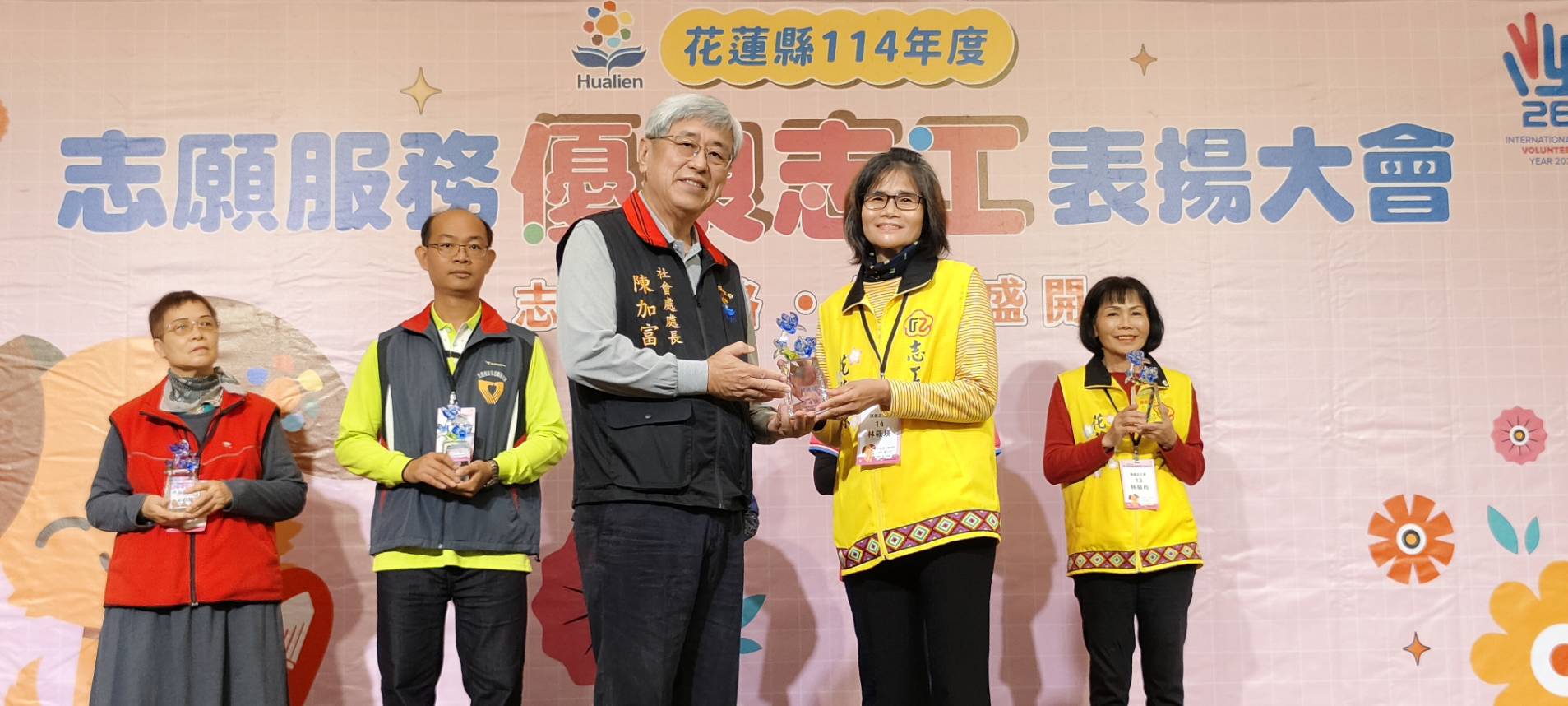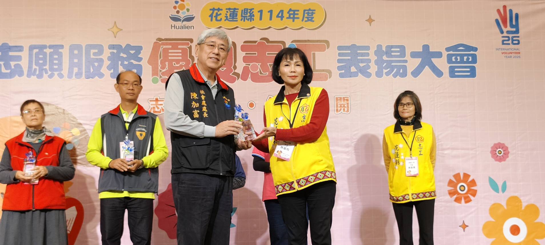 肯定志工無私的奉獻,花蓮縣114年度志願服務優良志工表揚大會-縣長榮耀表揚花蓮縣榮民服務處榮欣志工大隊-績優榮欣志工,家庭志工獎-楊愛玉、方鳳章、長青志工獎-陳彥蓉、謝阿髻、績優志工獎-林郁均、林筱瑛、感謝服務獎-林庭均、陳兆東等志工,表揚平日樂於奉獻時間、金錢及愛心的志工及志工團隊,藉由擔任志工,增加生命的深度、廣度,更能從中獲得生命的成就及價值。 相關照片