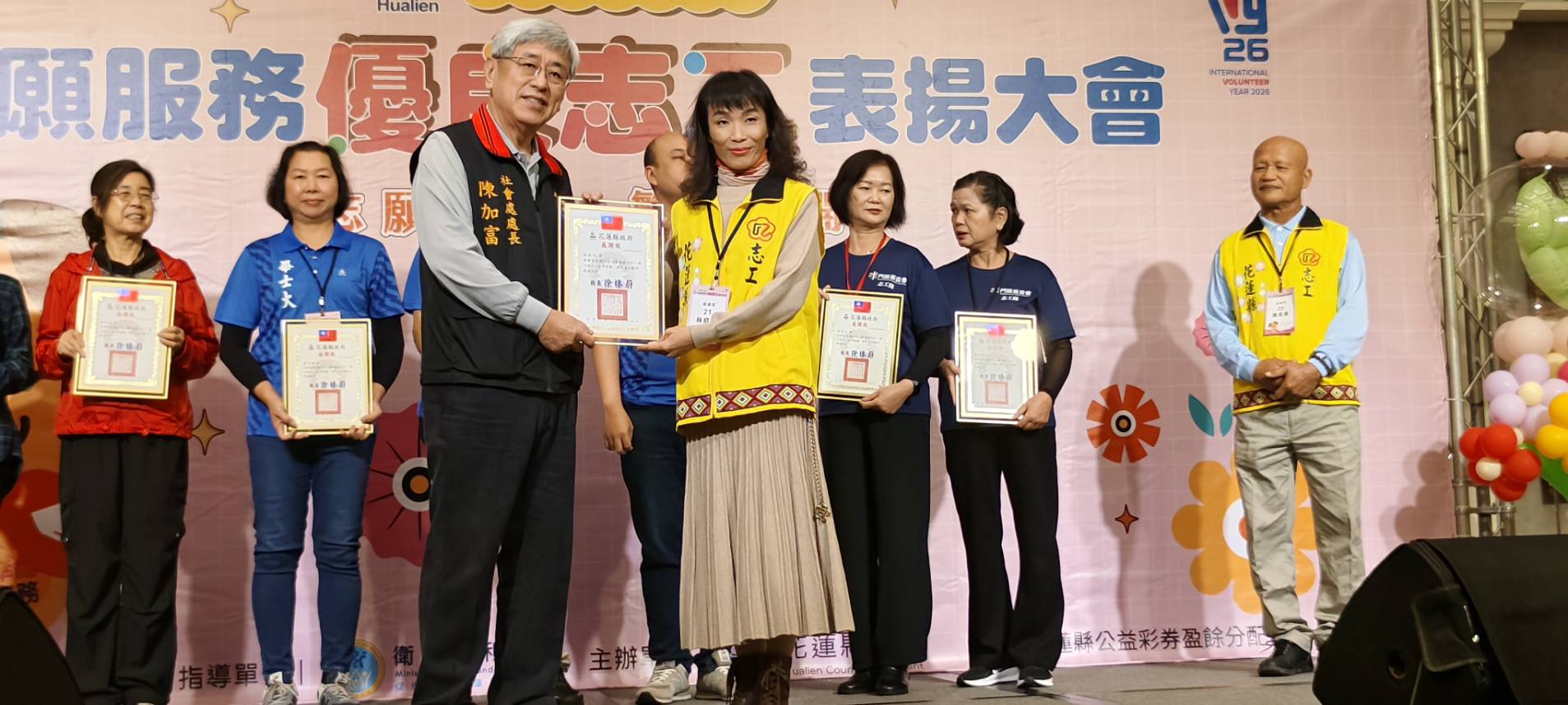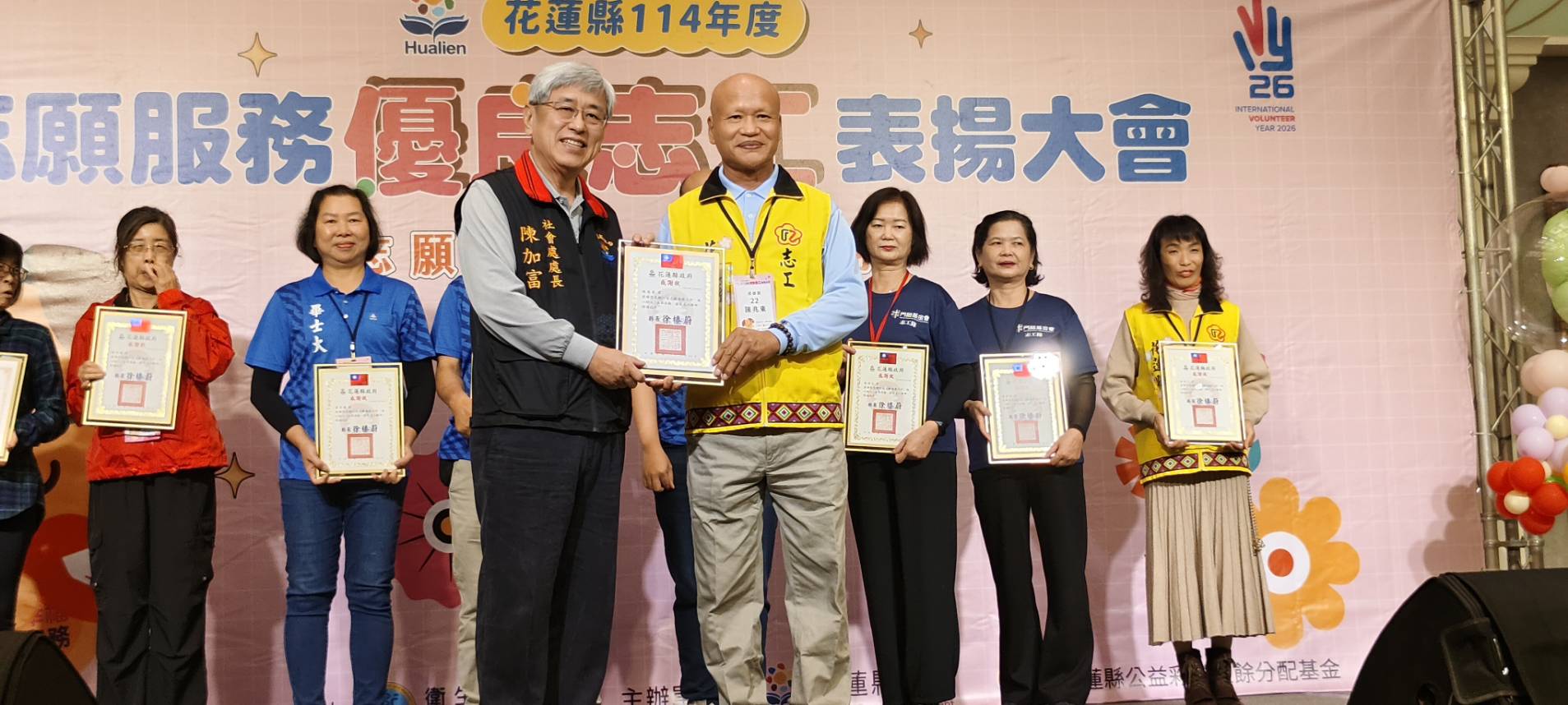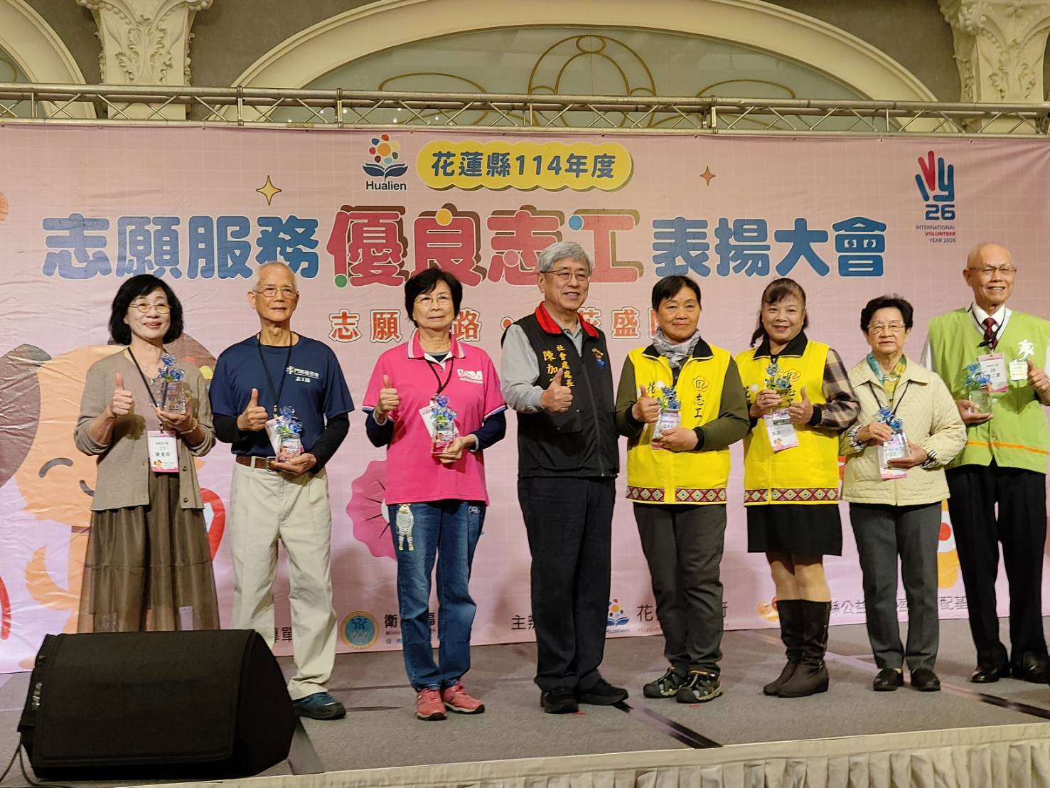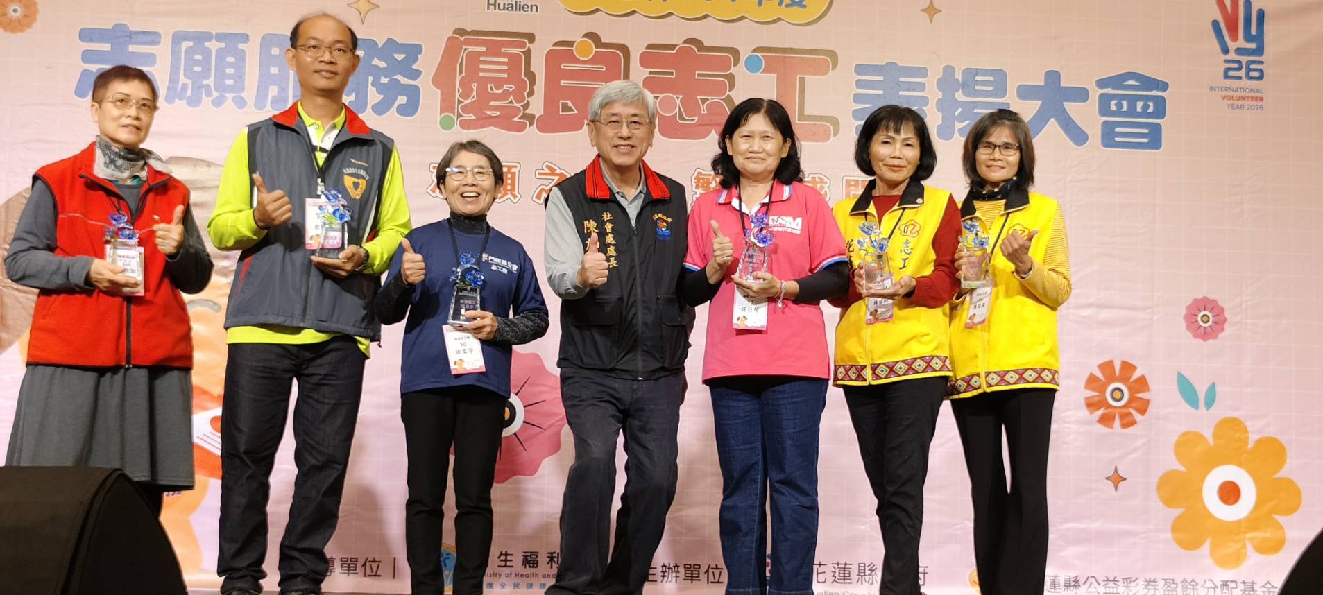 肯定志工無私的奉獻,花蓮縣114年度志願服務優良志工表揚大會-縣長榮耀表揚花蓮縣榮民服務處榮欣志工大隊-績優榮欣志工,家庭志工獎-楊愛玉、方鳳章、長青志工獎-陳彥蓉、謝阿髻、績優志工獎-林郁均、林筱瑛、感謝服務獎-林庭均、陳兆東等志工,表揚平日樂於奉獻時間、金錢及愛心的志工及志工團隊,藉由擔任志工,增加生命的深度、廣度,更能從中獲得生命的成就及價值。 相關照片