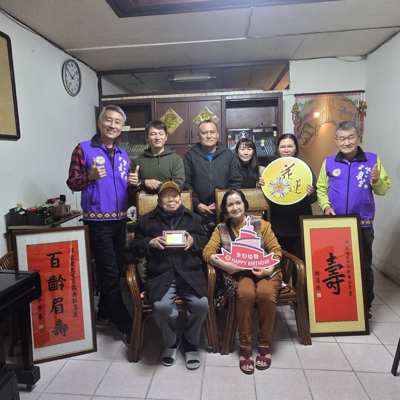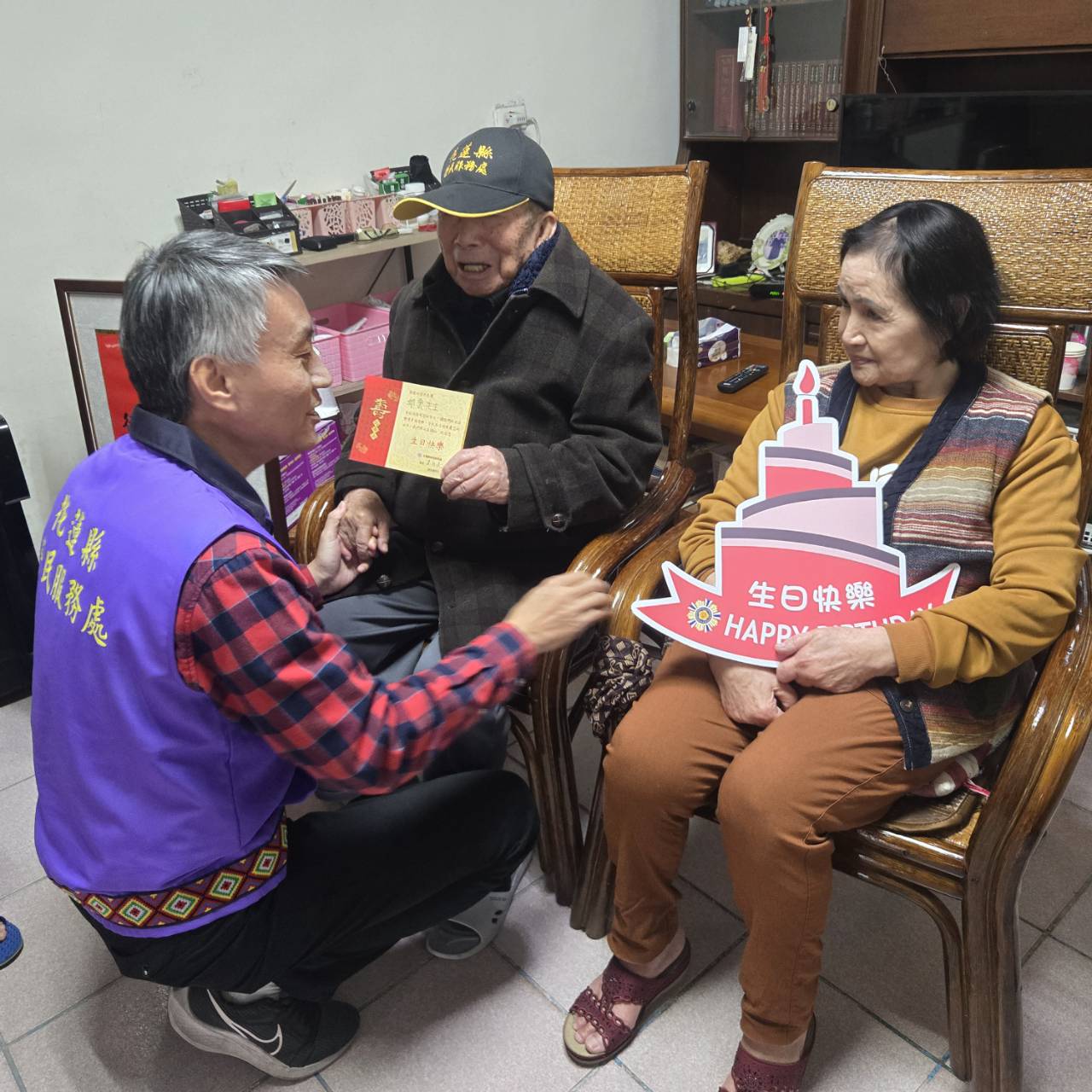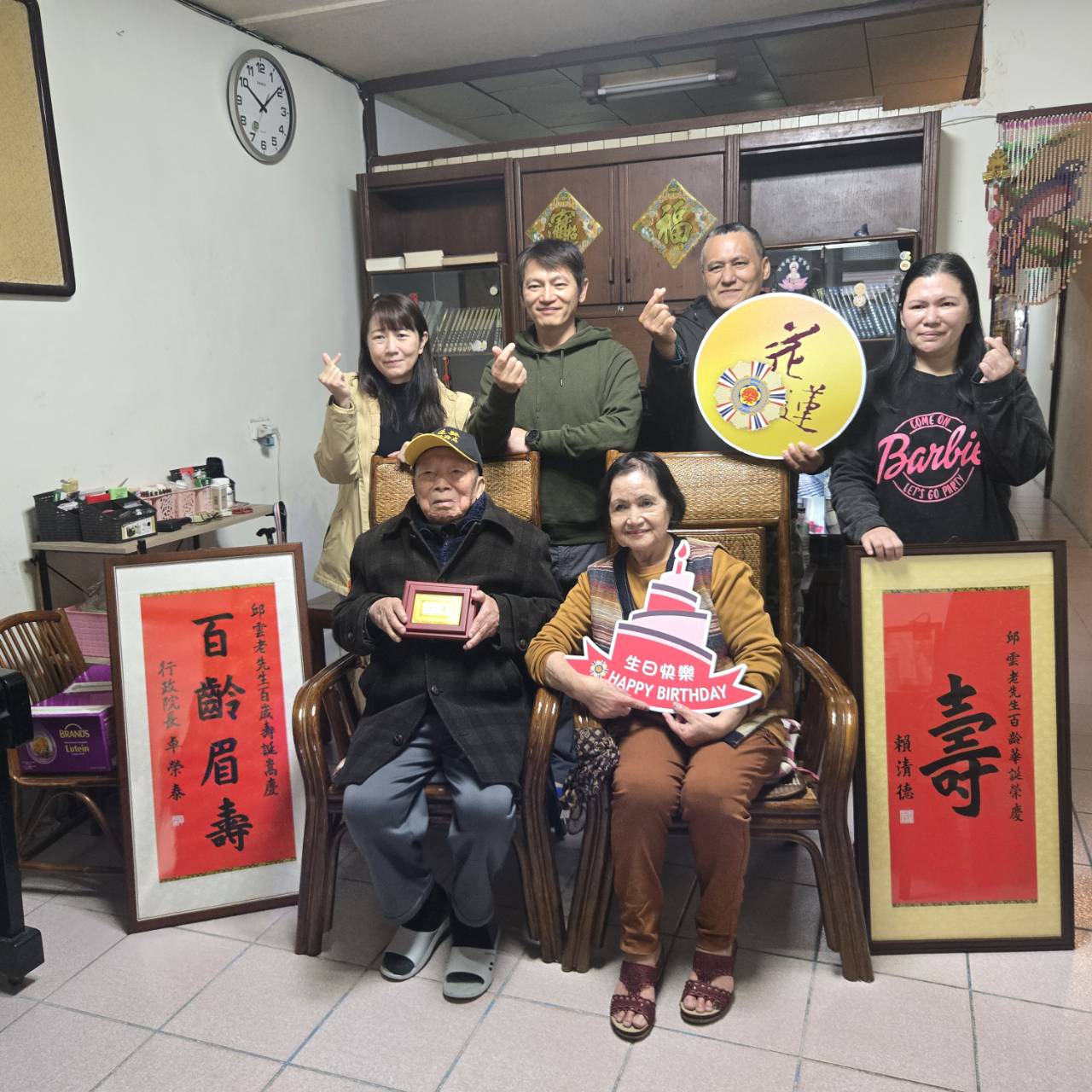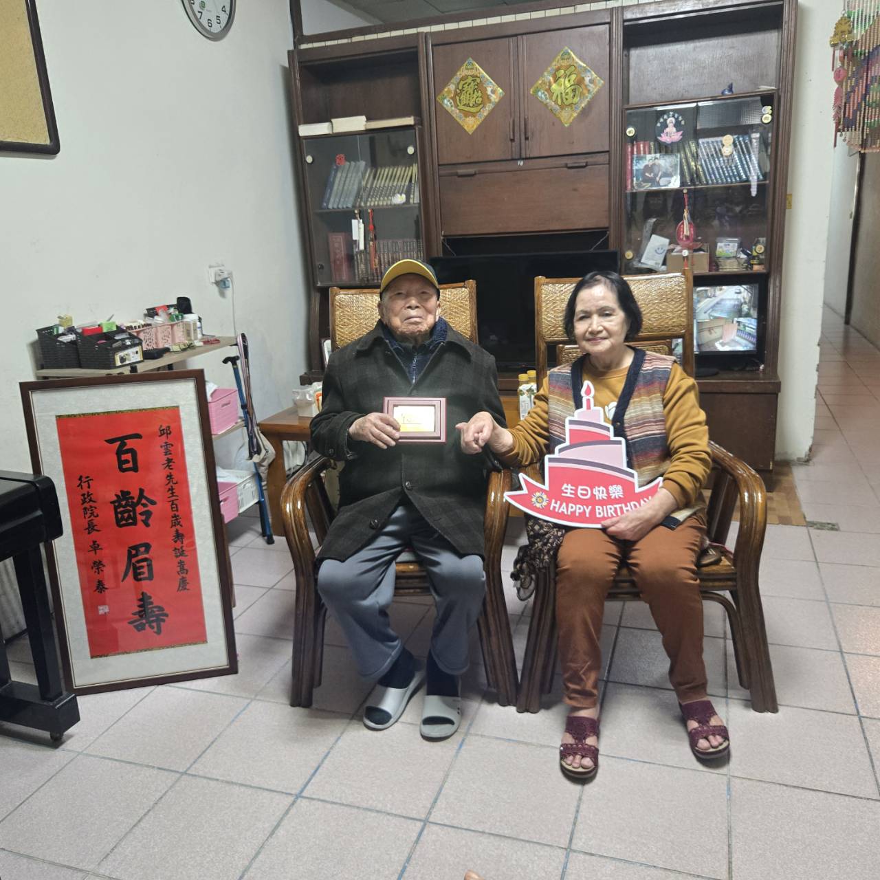 邱雲爺爺個性溫和敦厚,臉上總帶著慈祥笑容,114年12月適逢邱爺爺百歲壽誕,花蓮縣榮服處尊重家屬意願,不辧理慶生,處長蕭振嘉率所屬同仁及組長代表轉贈總統府及行政院祝賀壽屏、同時代表輔導會嚴主委致贈祝壽金飾,恭祝邱爺爺福壽綿長。 邱爺爺兒女都回來團聚,由處長轉贈祝賀金飾,歡唱〈生日快樂歌〉、獻上祝福,邱爺爺感動的心情溢於言表,氣氛熱鬧愉快。