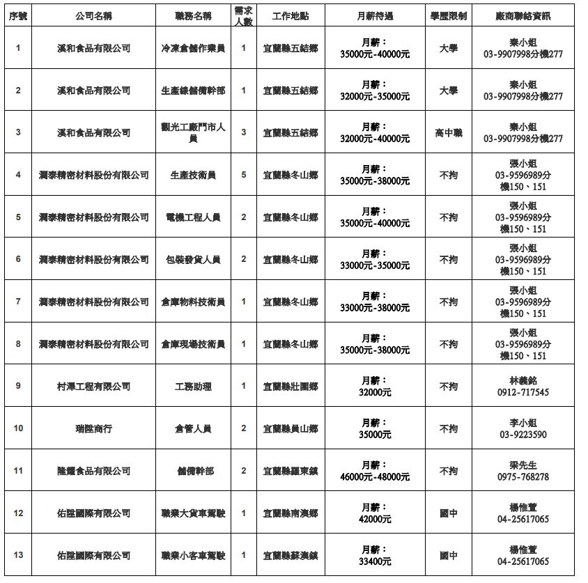 發布日期:115-03-24 資料來源:宜蘭縣榮民服務處 【宜蘭縣榮服處】廠商職缺表(115.03.30) 附件下載 檔案名稱 更新日期 下載次數 【宜蘭縣榮服處】廠商職缺表(115.03.30).pdf 115-03-24 0