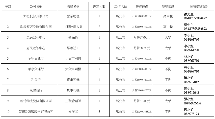 發布日期:115-03-30 資料來源:澎湖縣榮民服務處 【澎湖縣榮服處】廠商職缺表(115.03.30) 附件下載 檔案名稱 更新日期 下載次數 【澎湖縣榮服處】廠商職缺表(115.03.30).pdf 115-03-31 2