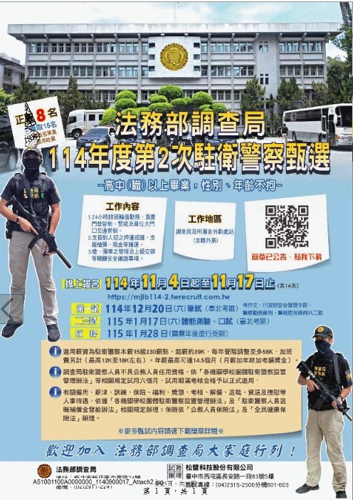 法務部調查局將辦理 「114年度第2次駐衛警察甄選考試」 一、即日起於甄試專案組網站(https://mjib114-2.twrecruit.com.tw)公告,提供電子檔免費下載,不另販售紙本。 二、甄試重要時程摘要如下: (一)報名期間:114年11月4日(星期二)14:00起至11月17日(星期一)17:00止。 (二)繳費期限:114年11月17日(星期一)23:59止。 (三)第一試(筆試)日期:114年12月20日(星期六)。 (四)第二、三試(體能測驗/口試)日期:115年1月17日(星期六)。 三、錄取人數暨相關規範,請詳閱甄試簡章。 附件下載