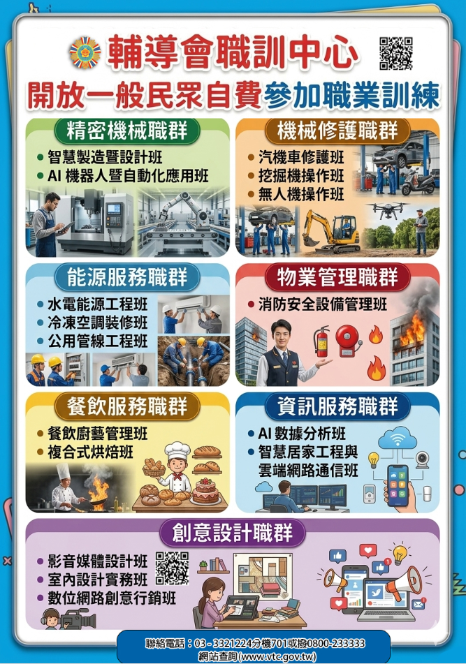 為增進輔導會職訓資源運用效益及推展職訓機構優質訓練,職訓中心開放未具退除役官兵或第一類退除役官兵之眷屬(配偶、子女及遺眷)身分者自費參加輔導會職訓機構自辦訓練📣