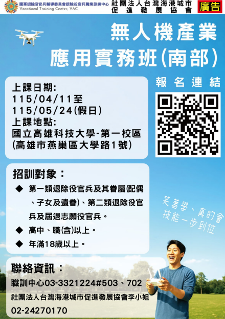 無人機課程115/04/11 ~ 115/05/24,報名期間為114/12/29 ~ 115/03/29 由桃園職訓中心委託社團法人台灣海港城市促進發展協會辦理 上課地點:高雄市燕巢區大學路1號(國立高雄科技大學-第一校區)