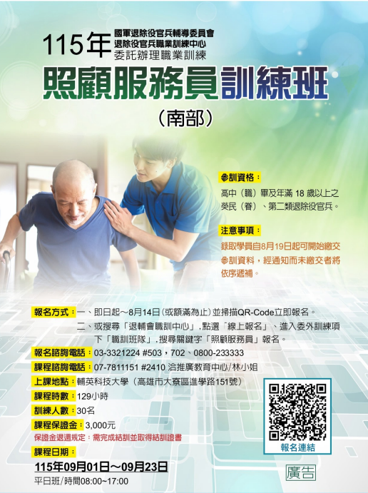 照顧服務員課程115/09/01 ~ 115/09/23,報名期間為114/12/29 ~ 115/08/14 由桃園職訓中心委託輔英科技大學辦理 上課地點:高雄市大寮區永芳里進學路151號(輔英科技大學)