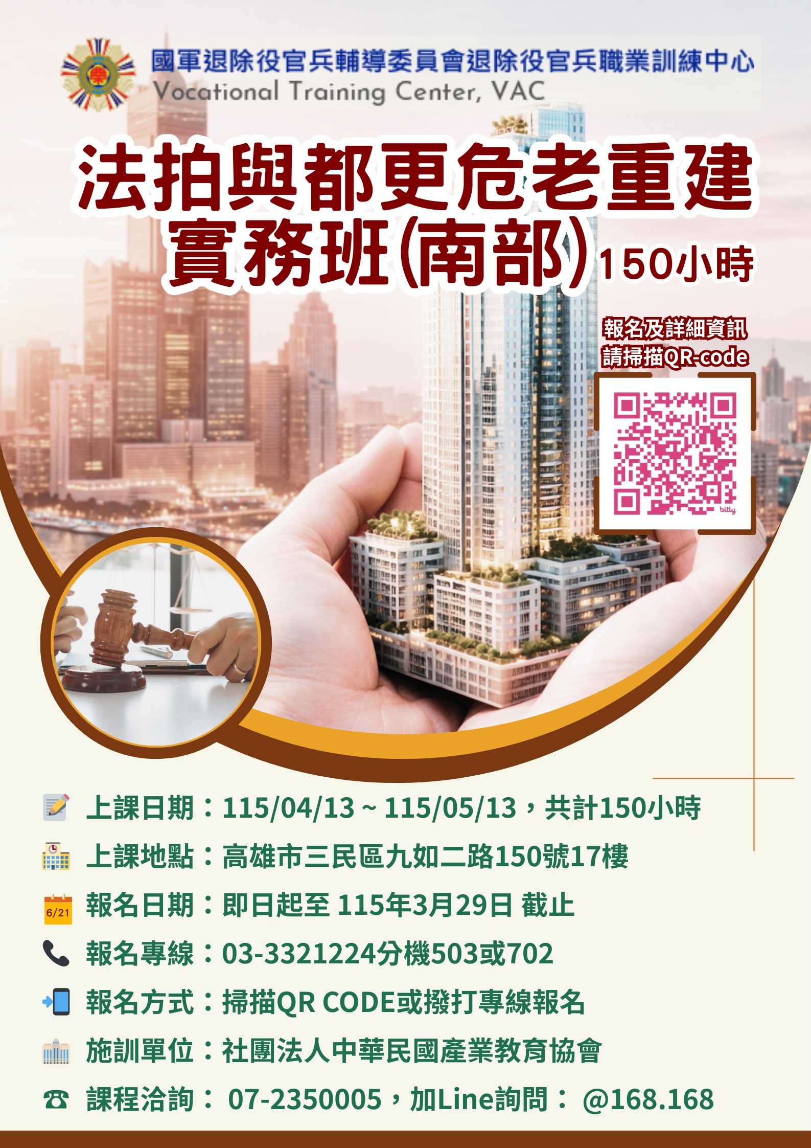 榮民榮眷補助課程,班名:法拍與都更危老重建實務班(南部)-150H