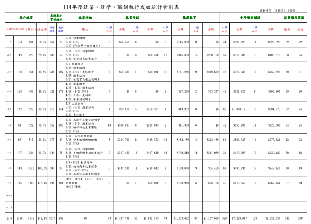 114年10月就業、就學、職訓執行成效統計管制表
