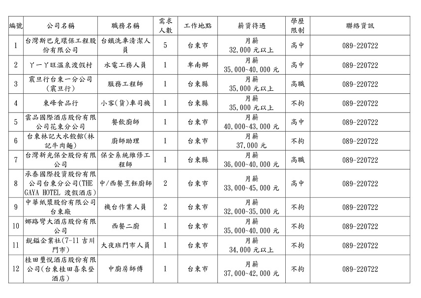 發布日期:114-10-22 資料來源:臺東縣榮民服務處 【臺東榮服處】廠商職缺表_114.10.22 附件下載 檔案名稱 更新日期 下載次數 【臺東榮服處】廠商職缺表_114.10.22.pdf 114-10-22 7