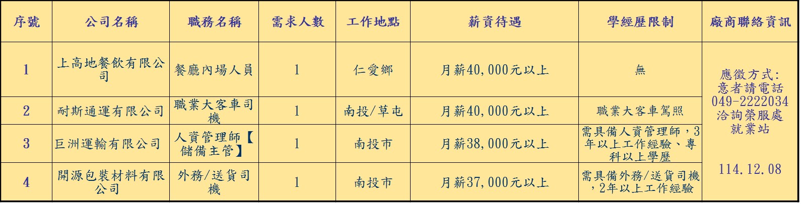 發布日期:114-12-08 資料來源:南投縣榮民服務處 【南投榮服處】廠商職缺表(114.12.08) 附件下載 檔案名稱 更新日期 下載次數 【南投榮服處】廠商職缺表(114.12.08).pdf 114-12-08 0
