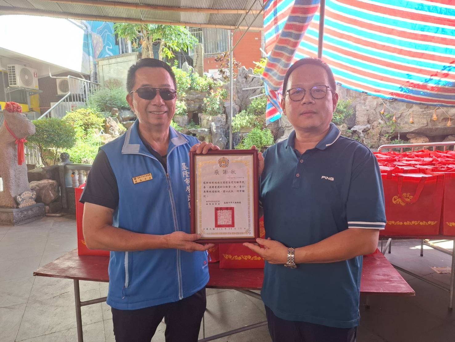 板橋埔墘福德宮於今(15)日,由陳貴欽主任代表捐贈基隆市榮服處綜合普渡物資及白米一批,委由榮服處轉發給服務轄區內亟需關懷的榮民眷,榮服處由方正處長代表受贈,並於福德宮內舉行簡單隆重的捐贈儀式,方正處長代表榮服處回贈感謝狀及紀念品,以申謝忱。