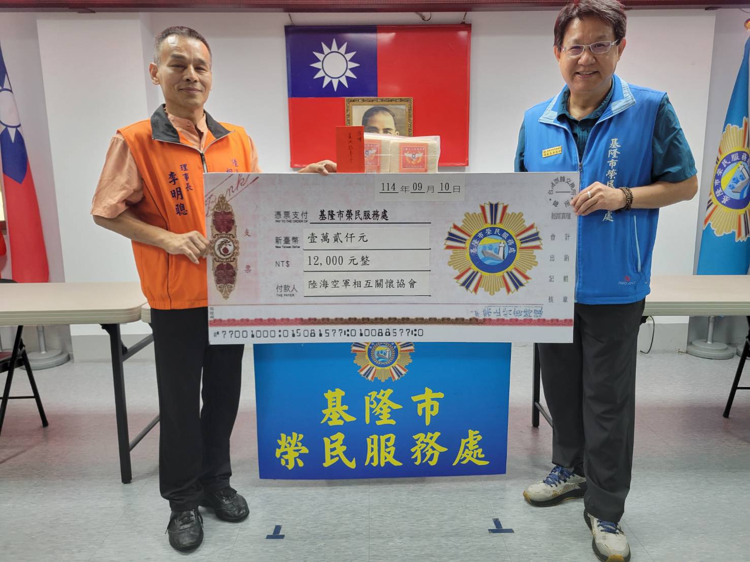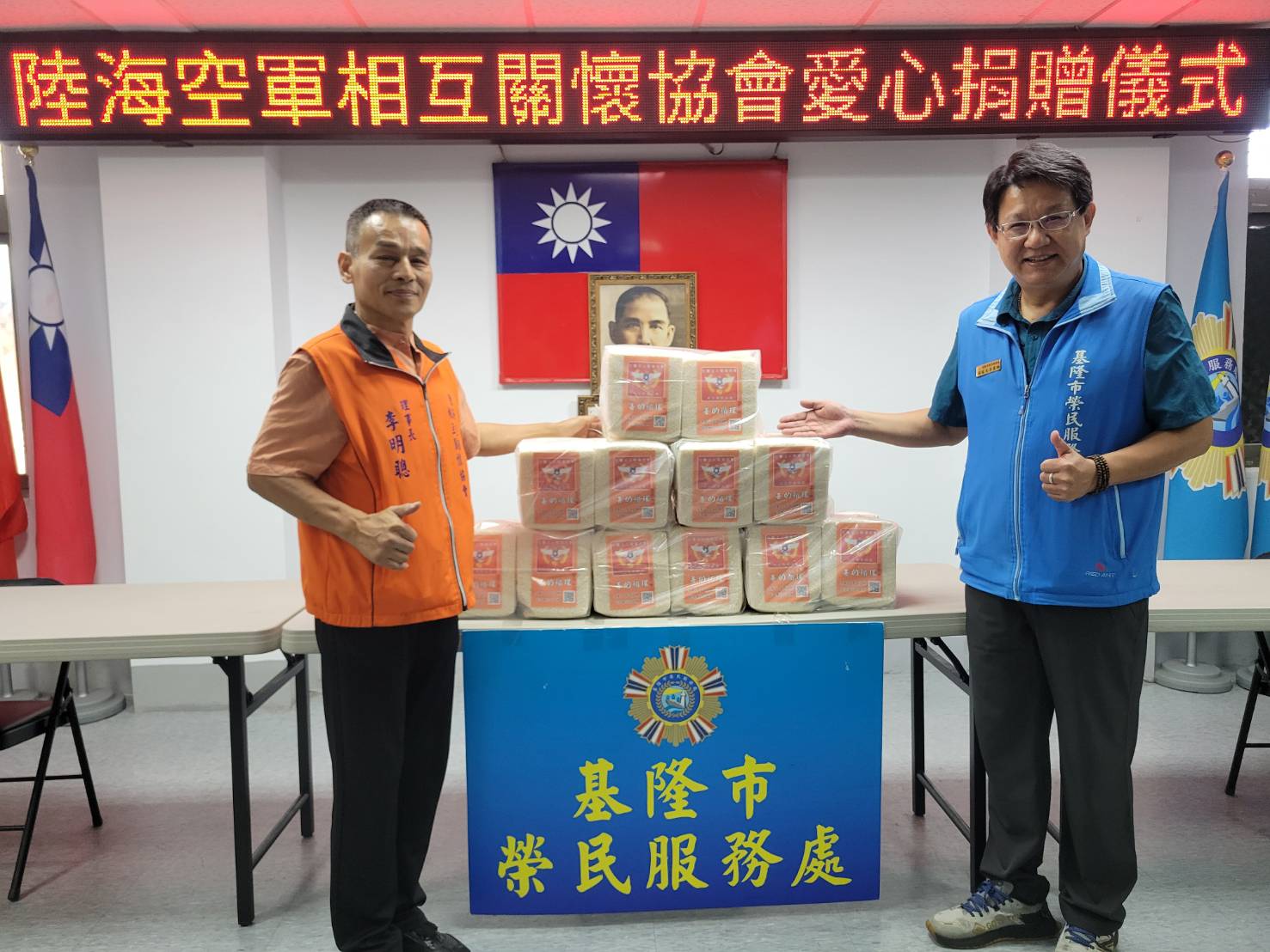 10日上午,陸海空軍相互關懷協會李明聰理事長及董麗華特助,赴基隆市榮民服務處捐贈遺孤認養金及物資一批,委請榮服處在秋節前轉發需要關懷的榮民眷;受到李復鄉副處長及同仁熱誠接待,並進行了簡單隆重的捐贈儀式,李復鄉副處長代表受贈,並回贈感謝狀及紀念品,以感謝協會的善行義舉。