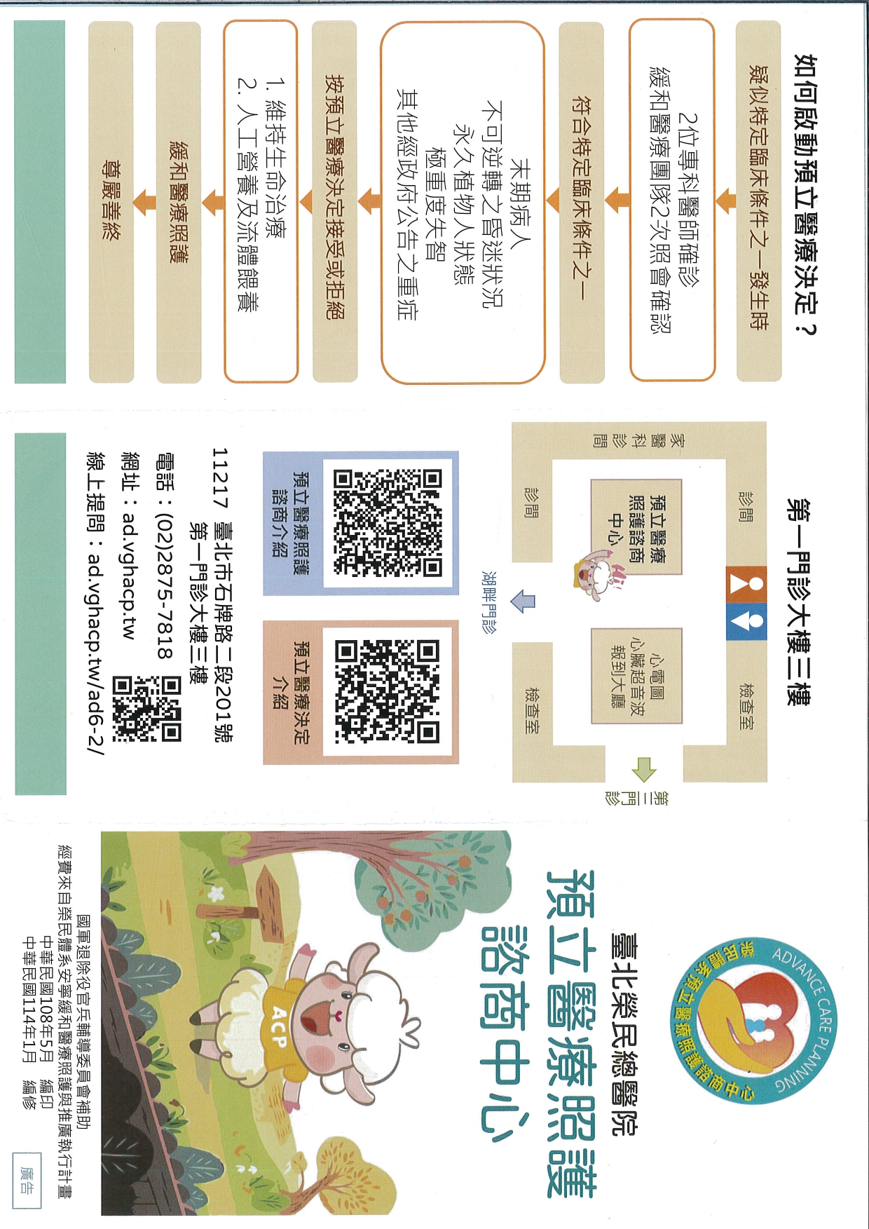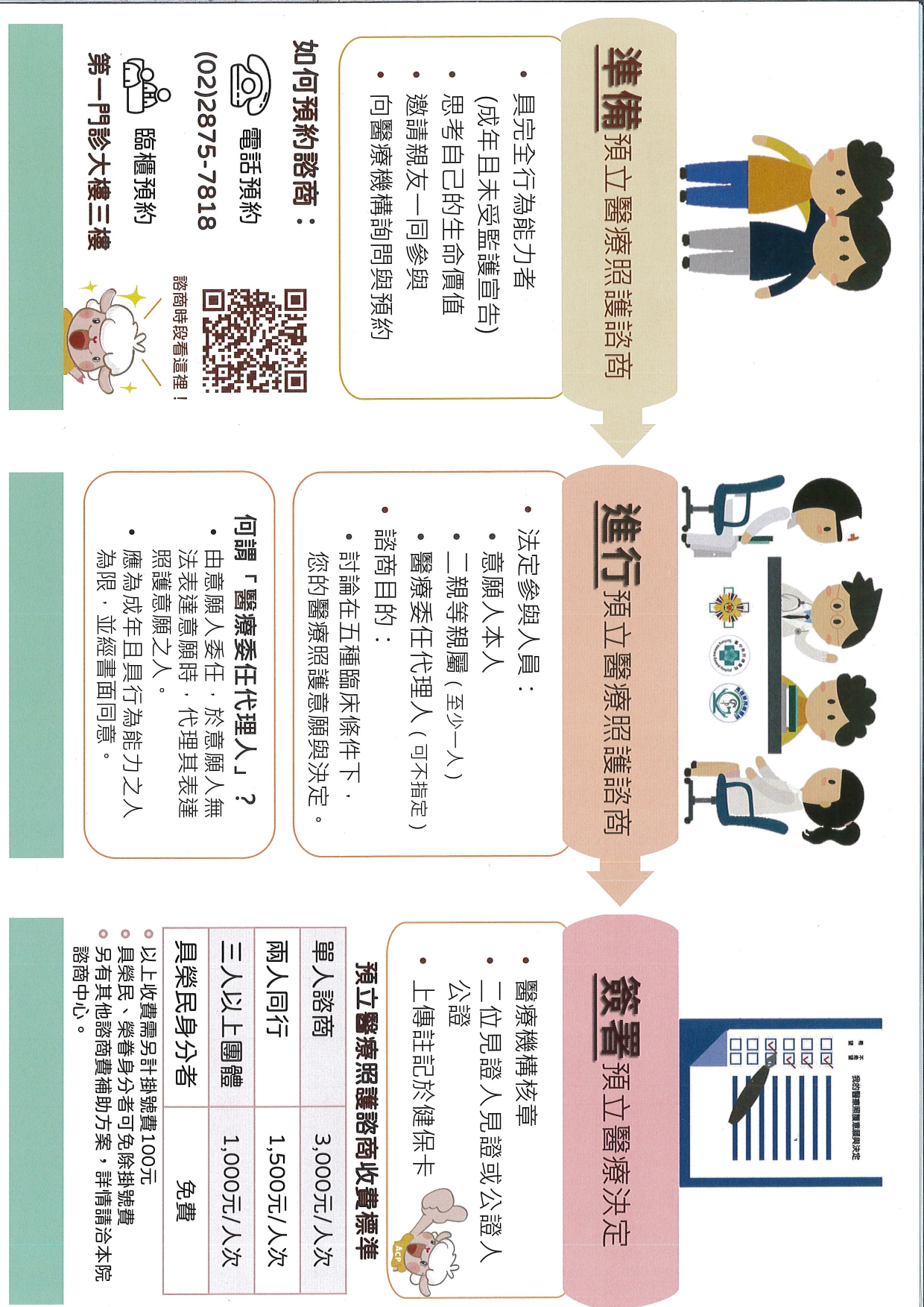 預立醫療(通常指「預立醫療決定」,英文為Advance Decision, AD)是根據台灣《病人自主權利法》所設立的制度,讓人們在意識清楚時,簽署書面文件預先表達在未來符合「特定臨床條件」(如末期疾病、永久昏迷等)時,希望或不希望接受特定維生治療、人工營養及流體餵養的意願,以保障個人醫療自主權與尊嚴。 1.榮民或榮遺眷身分者,免收諮商費及掛號費。 2.榮眷(榮民配偶、子女、父母)者,依單人或雙人計價1,500元/人、三人以上計價1,000元/人,免收掛號費。 詳見資訊及門診預約,請見臺北榮總預立醫療門診: https://wd.vghtpe.gov.tw/fm/Fpage.action?muid=12115&fid=11216