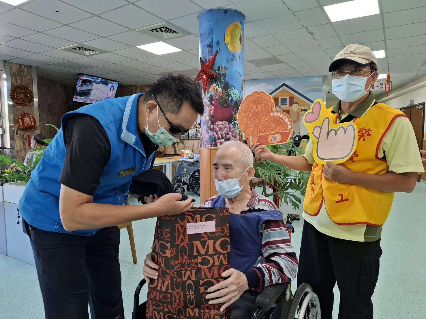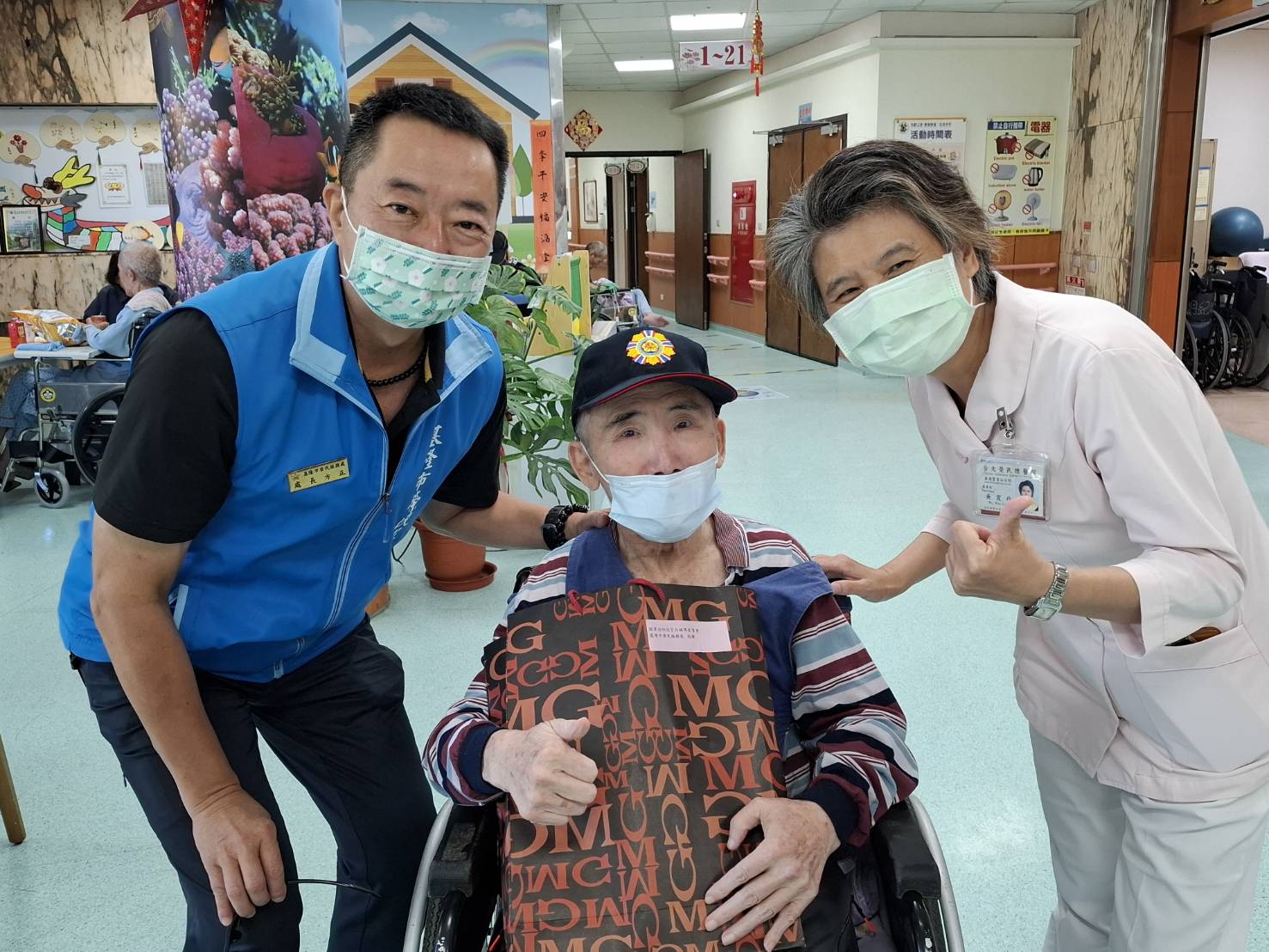 方正處長在蘇澳分院由社工師及護理長陪同下,逐一至各病房親切問候每位住院榮民長輩,關懷住院情況,此次除營養慰問品外,考量入秋後天氣將轉涼,榮服處還準備了圍巾及帽子,以表達榮服處關懷之意,並祝福榮民長輩早日康復及預祝中秋佳節愉快。方正處長,溫馨關懷長輩們住院之身心情況,並叮嚀前輩們保持愉快心情、安心靜養。其中,長期住在員山分院的蕭伯伯因年邁,目前於今年四月甫設立的安寧緩和病房靜養,該院區擁有最新進的洗澡機及善心人士捐贈的電動床,並運用燈光打造溫馨、安心的溫馨氛圍。
