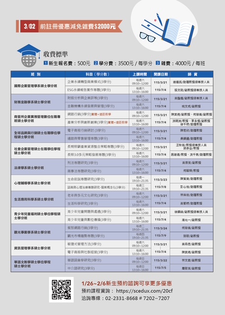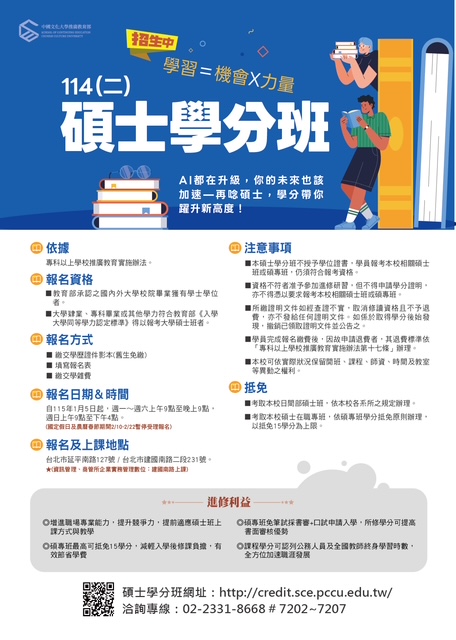 中國文化大學【碩士學分班】熱烈招生中~ 升級自己,開啟新篇章——再唸碩士,為夢想加速! 升級,從來不是因為你不夠努力,而是因為你還少了一些學分加持。讓學習成為推動你未來的動力,跨越時光,開創屬於你的無限可能! 加入我們的碩士學分班,與來自各行業的精英智者同行,激發創造力,拓展思維深度。我們專為主管、經理人及企業主精心設計課程,緊扣職場實務,助您輕鬆實現學術與現場的無縫接軌。 這不僅是學習的起點,更是您提升領導力與洞察力的絕佳平台。讓學習成為您事業升級的強大引擎! 在這裡,年齡只是數字,智慧才是最珍貴的財富。 碩士學分班進修利益 ●提升職場專業與競爭力,預先適應碩士教學模式,強化專業實力