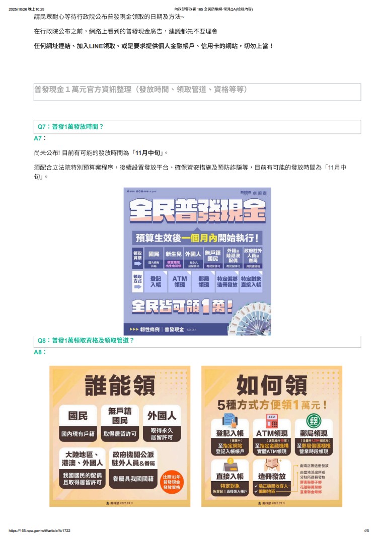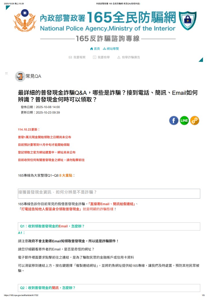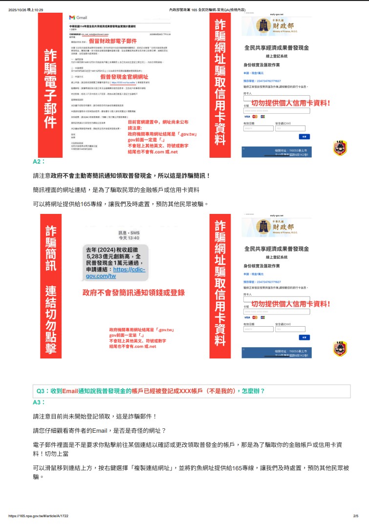 宣導內政部警政署 165 全民防騙網對政府「普發萬元」防詐騙宣導內容
