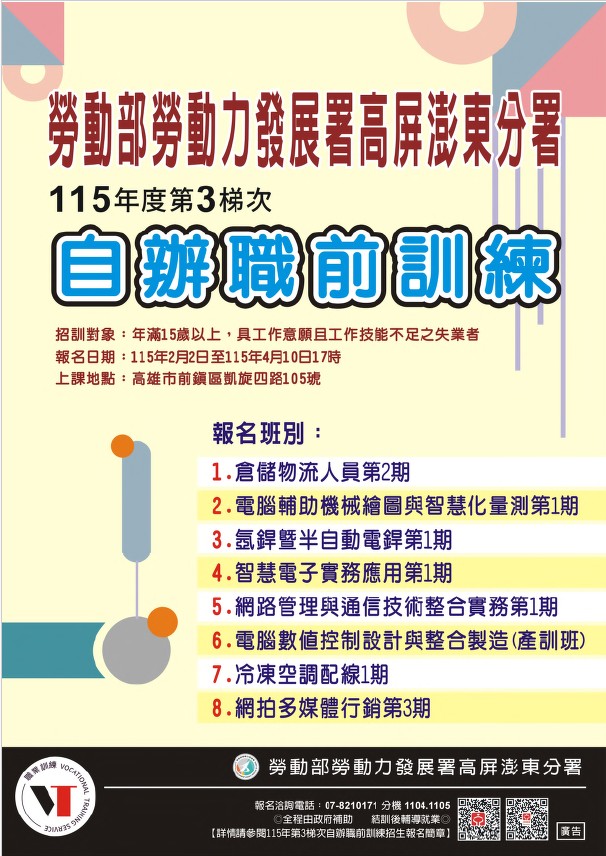 勞動部勞動力發展署高屏澎東分署115年度第3梯次自辦職前訓練招生海報